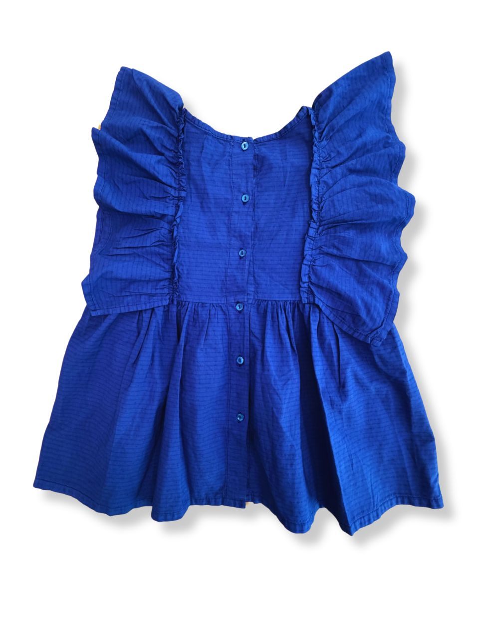 Dieses blaue Blusen-Top besticht durch seinen eleganten Stil und die hochwertigen Materialien. Die Rüschen an den Schultern verleihen dem Kleid eine verspielte Note, während der fließende Schnitt für einen romantischen Look sorgt.