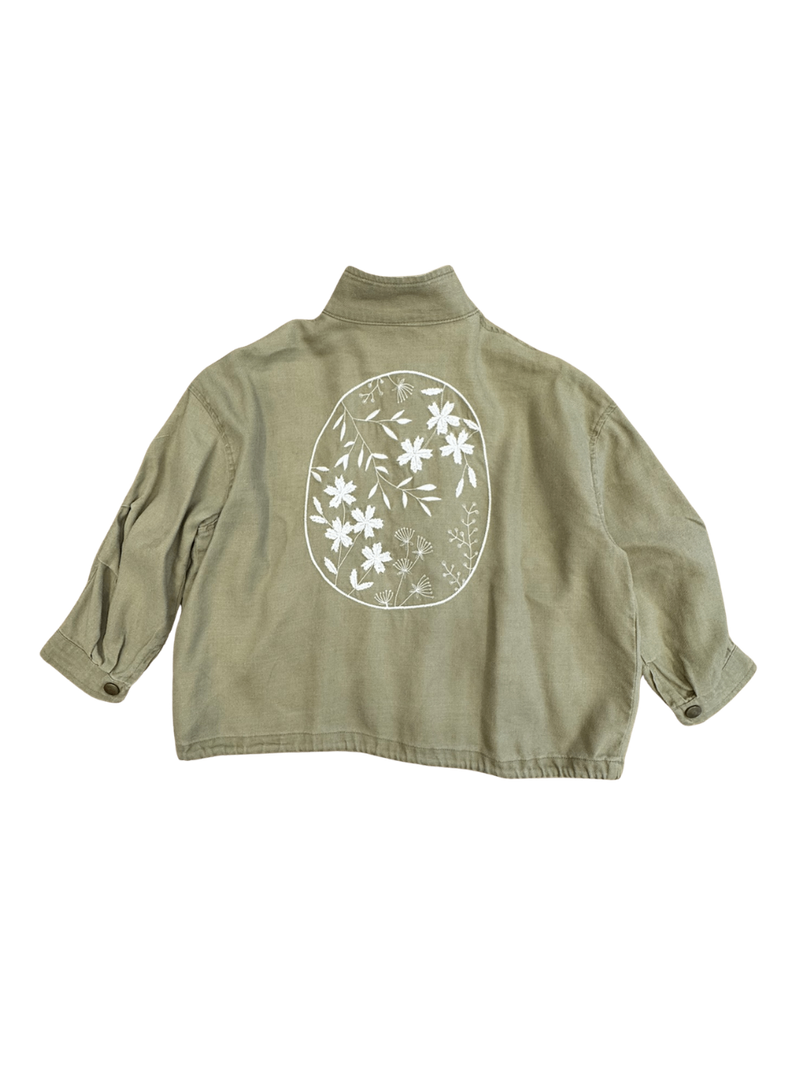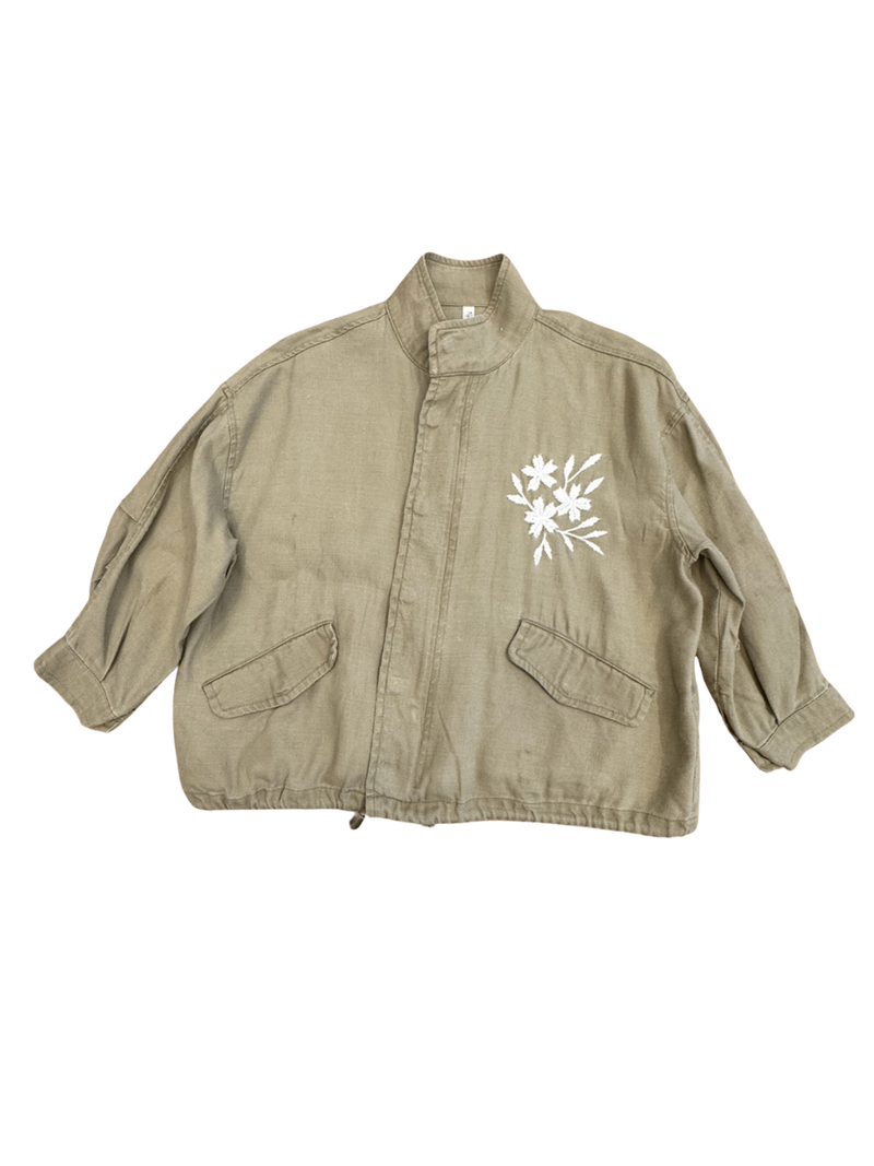 Diese olivfarbene Leinen-Jacke ppunktet mit praktischen Patten-Taschen. Der lockere Schnitt verleiht einen lässigen Look. Das weiße Blumen-Motiv setzt einen romantischen Akzent auf der Brustpartie. NP: 99€