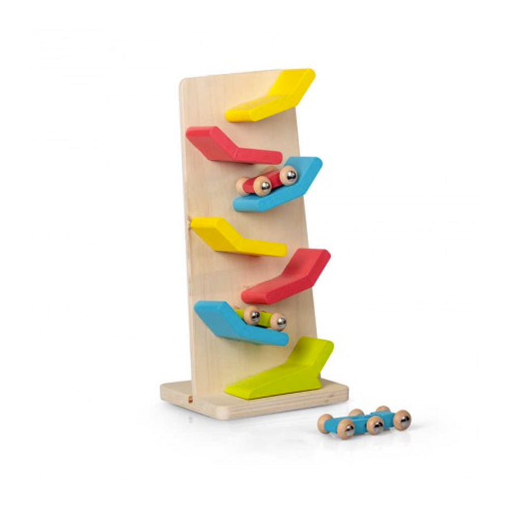 Setze das Auto auf die Rampe, es saust die ganze Wand herunter. Beim Flippen kommt das 'Klick-Klack' Geräusch. Fördert die Feinmotorik und regt die Phantasie an. Inhalt: Rampenwand aus Holz, 3 Autos aus Holz. Einfach & genial.