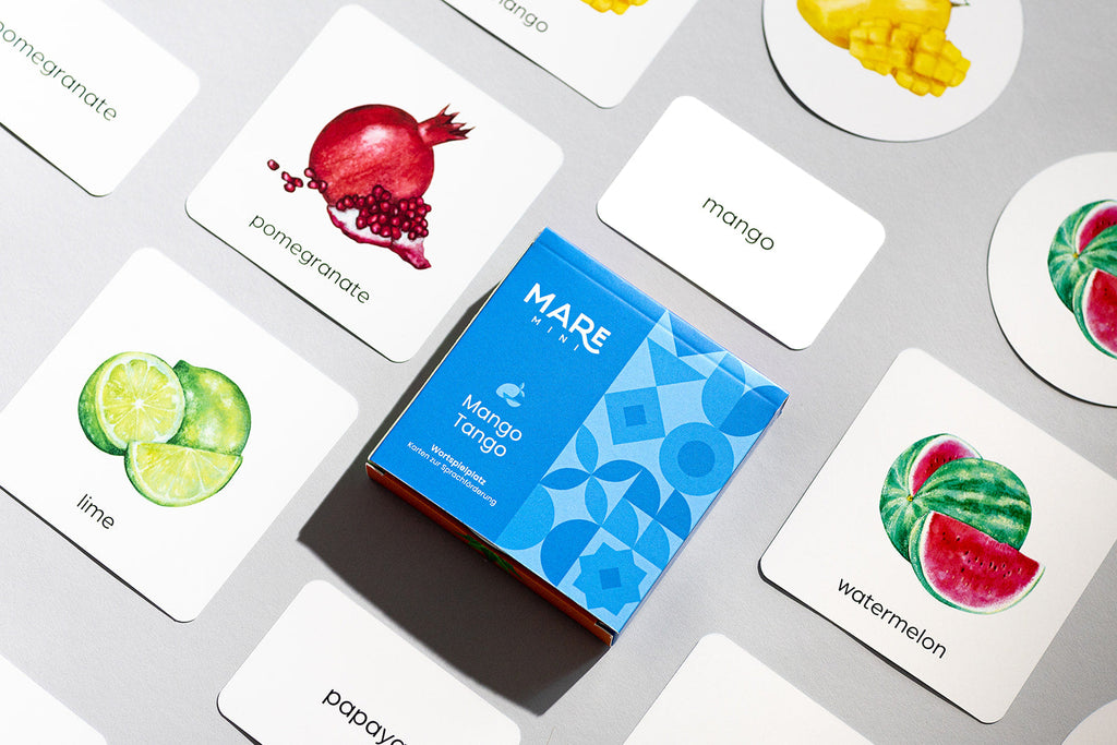 Mit maremini® Exotische Früchte entdecken Kleinkinder ab 2 Jahren Mango, Papaya & Co. auf spielerische Weise. Das Montessori-System aus Bild-, Wort- und Kontrollkarte startet als Merk- und Zuordnungsspiel und wächst bis zum Lesen lernen in der Vorschule.