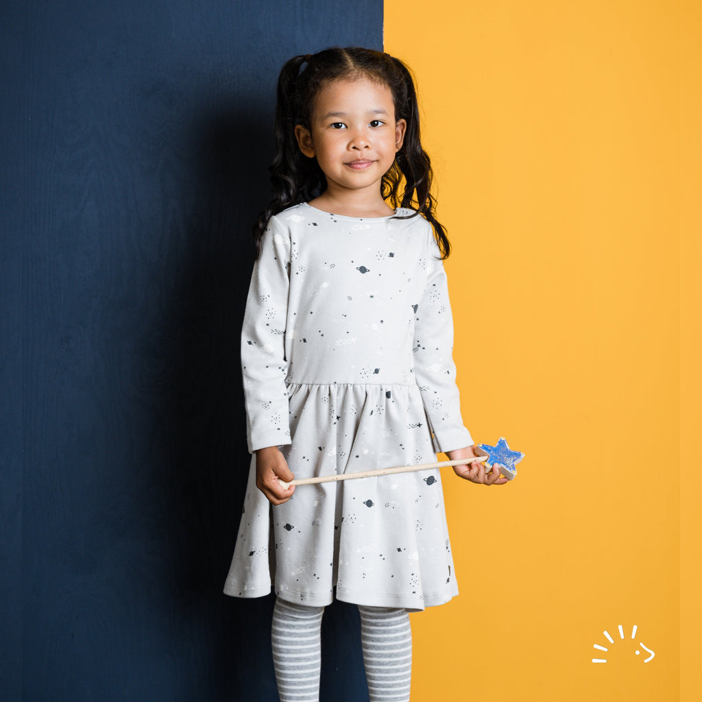 Dieses Kleid kombiniert Stil und Komfort mit einem bequemen, kindgerechter Schnitt, langen Ärmeln und einem weit schwingenden Rockteil, der viel Bewegungsfreiheit bietet.