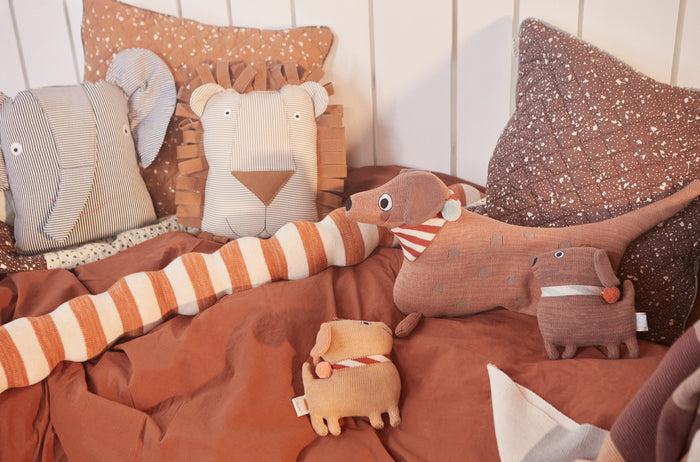 Our Hunsi Dog is a cute dog that comes with two puppies, Coco and Max. There is room for the puppies in Hunsis tummy, which can be opened and closed with velcro closure. A playful and cute toy, that the little ones in the family will love. The dog and puppies are made of 100% cotton in a fine knitted quality.Style no. M107119 Color: Multi Material: 100% Cotton, 100% Recycled Polyester Filling Dimensions: H36 x L35 x W16 cm / H17x L14 x W6 cm