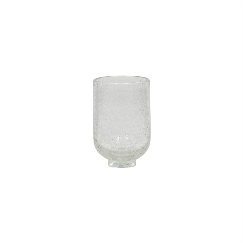 The Kuki Hurricane in glass features bubble splashes that add a touch of whimsy to its minimalist design. Its sturdy base adds a playful element to its timeless aesthetic, blending functionality with elegance. Perfect for holding candles or as a decorative piece. Being mouthblown, each hurricane will vary in size, adding to its unique charm.