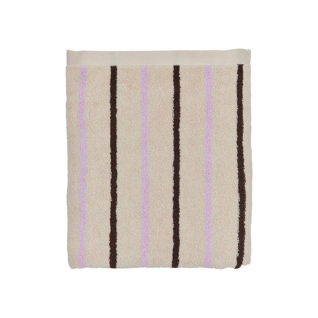 Create a personal expression with towels and wash towels from the beautiful Raita series. The series is characterized by its striped design that is timeless and fit beautifully into any bathroom. The name is not random as Raita means stripe in Finnish.The Raita Towel in Purple/Clay/Brown is made of organic cotton terry and is just what you need after a relaxing shower.We recommend soaking the towel in cold water overnight before the first wash. This improves the ability to absorb water.Machine wash at 60°Style no. L300659 Material: 100% Organic Cotton Dimensions: H140 x W70 cm