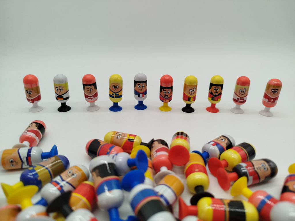 Dieses Spielzeugset enthält eine Vielzahl von Soccer Kickers verschiedener europäischer Nationalmannschaften der Eigenmarke Kaufland. Die Soccer Kickers lassen sich an glatten Oberflächen befestigen, sammeln oder man kann mit ihnen Brettspiele wie Mensch-Ärgere-Dich-Nicht spielen. Der Zustand ist gebraucht, mit leichten Gebrauchsspuren. Hinweis: Nicht für Kinder unter 3 Jahren geeignet, da Kleinteile verschluckt werden können. Verpackung: Ohne Originalverpackung.