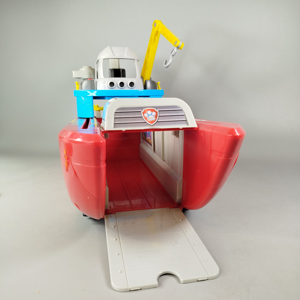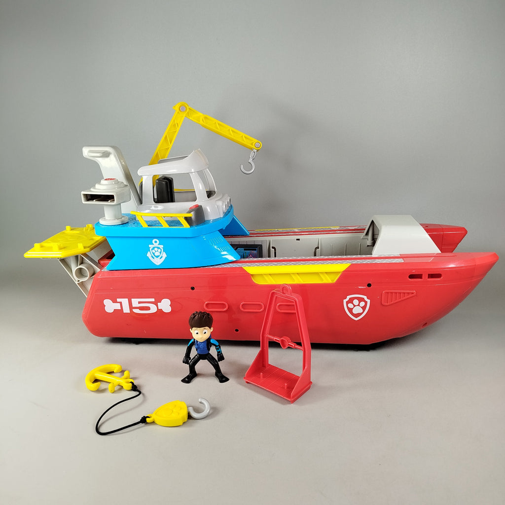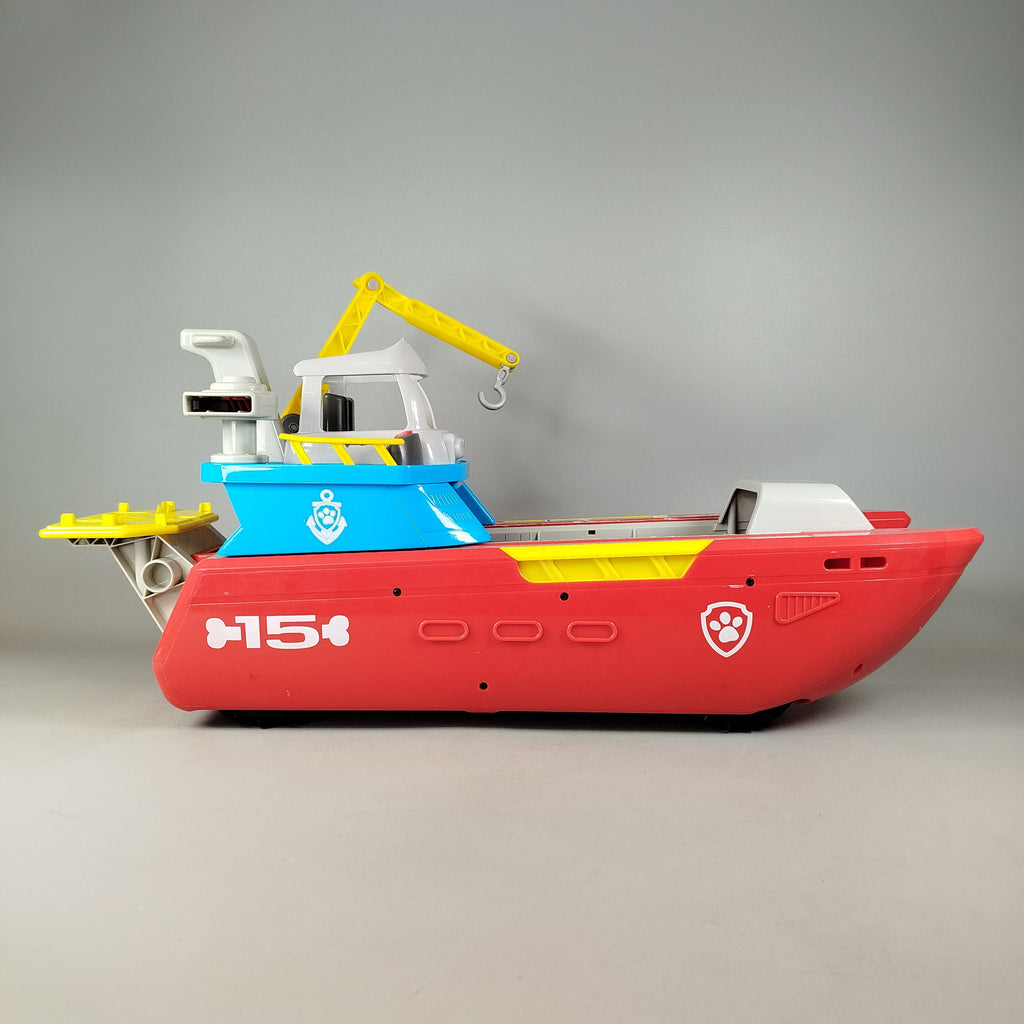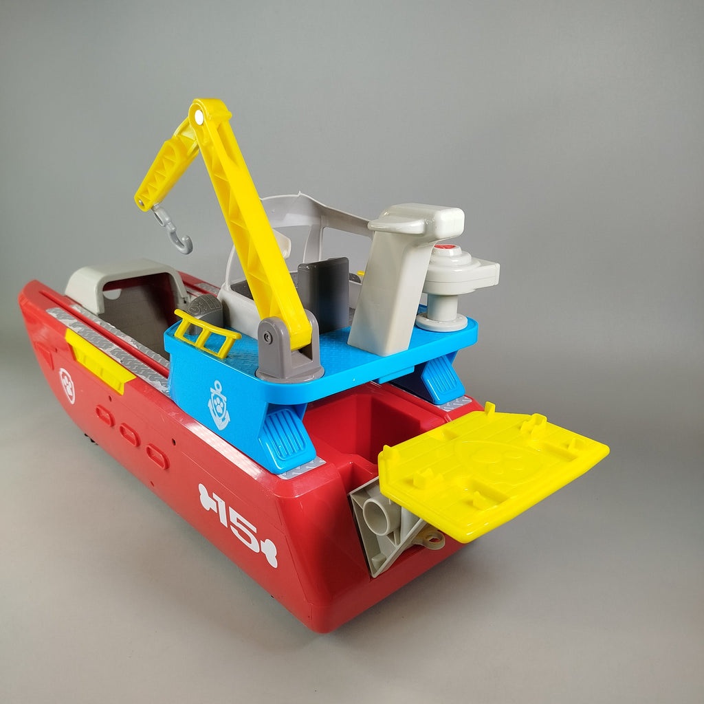 Hol dir das Paw Patrol Spielset mit großem roten und blauen Boot, gelbem Kranarm und einer Spielfigur im Taucheranzug. Das Boot trägt das bekannte Pfotenlogo und die Zahl 15 an den Seiten. Zubehör wie eine Winde mit Haken und eine Ladeplattform sind enthalten. Ideal für actionreiche Abenteuer auf See. Die Verpackung fehlt, Vollständigkeit konnte nicht überprüft werden. Das Spielzeug befindet sich in gutem gebrauchten Zustand.