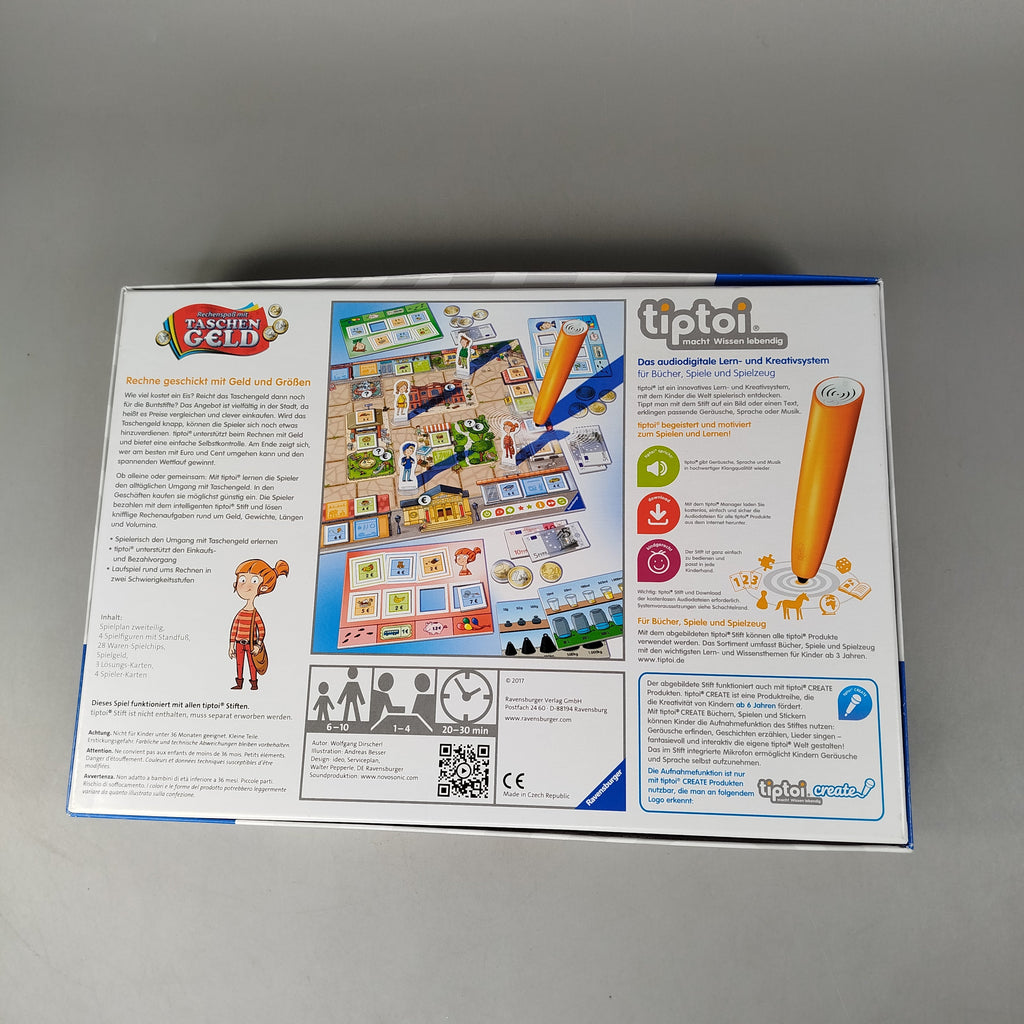 Hol dir das Lernspiel Rechenspaß mit Taschengeld von Ravensburger und tauch spielerisch in den Umgang mit Geld und Größen ein. Das audiodigitale tiptoi Spiel bietet ein interaktives Spielerlebnis mit Spielbrett, Spielfiguren, Würfel, Spielgeld sowie Karten und Plättchen und ist für 1–4 Kinder ausgelegt. Gespielt wird gemeinsam mit dem tiptoi Stift, der für die Nutzung erforderlich ist, aber nicht enthalten ist. Gib diesem Spielzeug ein neues Zuhause und ermögliche spielerisches Lernen mit System. Hinweis: Enthält Kleinteile.