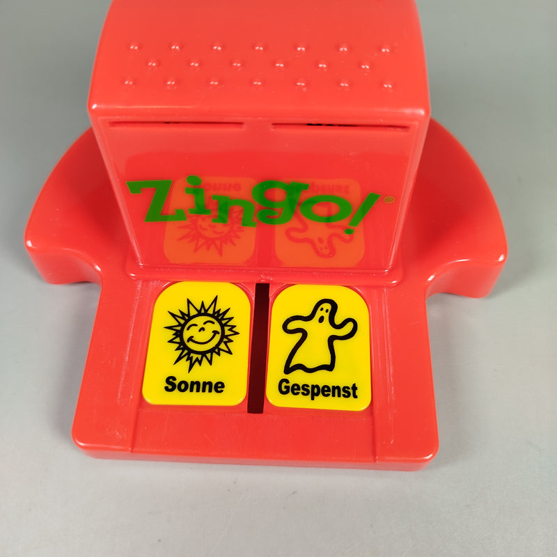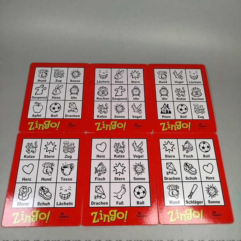 Hol dir das spannende Kinderspiel Zingo! und bring Spaß in dein Zuhause! Dieses Set enthält das ikonische rote Zingo! Plättchenausgabegerät, Spielplättchen und 6 Spielkarten mit deutschen Wörtern und passenden Bildern wie Katze, Ball und Herz. Alles in neuwertigem Zustand und mit Spielanleitung. Gib diesem Spiel ein neues Zuhause und erlebe strahlende Kinderaugen! Hinweis: Nicht für Kinder unter 3 Jahren geeignet wegen verschluckbarer Kleinteile. Das Spiel befindet sich in einem neuwertigen Zustand mit minimalen Gebrauchsspuren an der Verpackung.