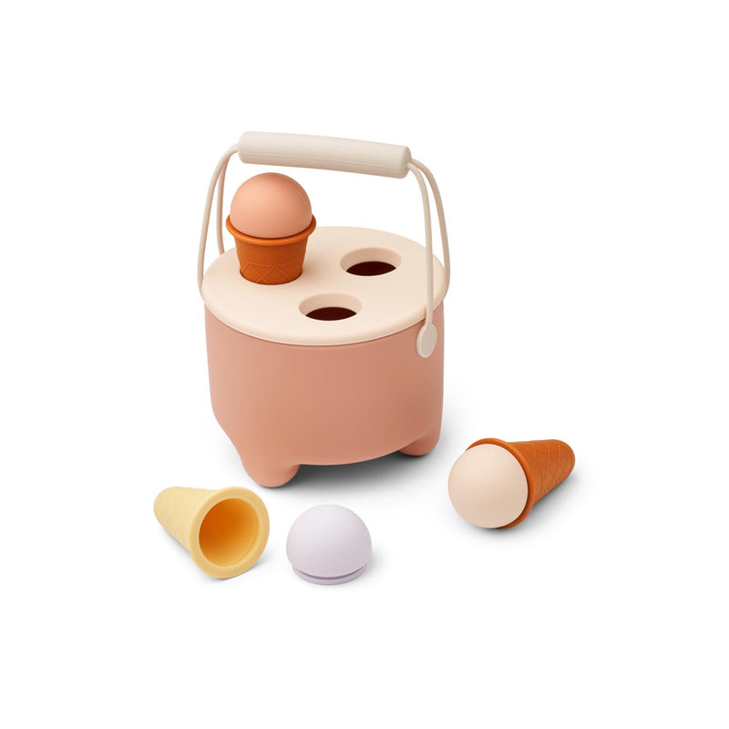 Das Spielset enthält einen tragbaren Eimer, einen Eiscreme-Halter und drei Eiscremes, die sich auseinander und zusammensetzen lassen – ganz wie es deinem Kind gefällt.