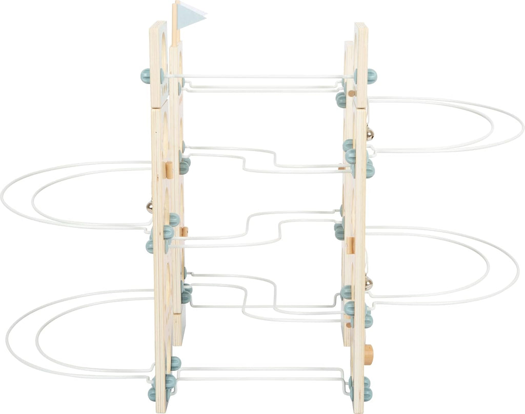 - Stopper und Glöckchen zum Ausbremsen der Kugeln sorgen für Aha-Effekte und akustische Reize