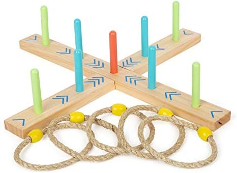 - Das Wurfspiel aus naturbelassenem und bunt lackiertem Holz kann ganz einfach zusammengesteckt und losgespielt werden, es besteht aus einem Zielkreuz und 5 Wurfringen