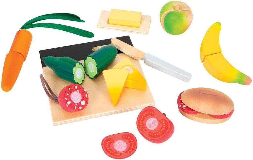 • Umfangreiches Spielset bestehend aus 1 Tomate, 1 Gurke, 1 Möhre, 1 Apfel, 1 Banane, 1 Stück Käse, 1 Stück Salami, 1 Stück Butter, 1 Schale, 1 Brötchen, 1 Schneidebrett, 1 Messer