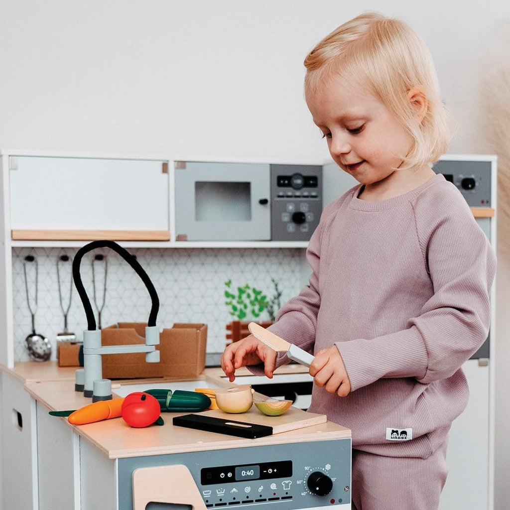 • Die Spiel-Lebensmittel sind durch Klettpunkte miteinander verbunden und können mithilfe des Holzmessers geschnitten werden