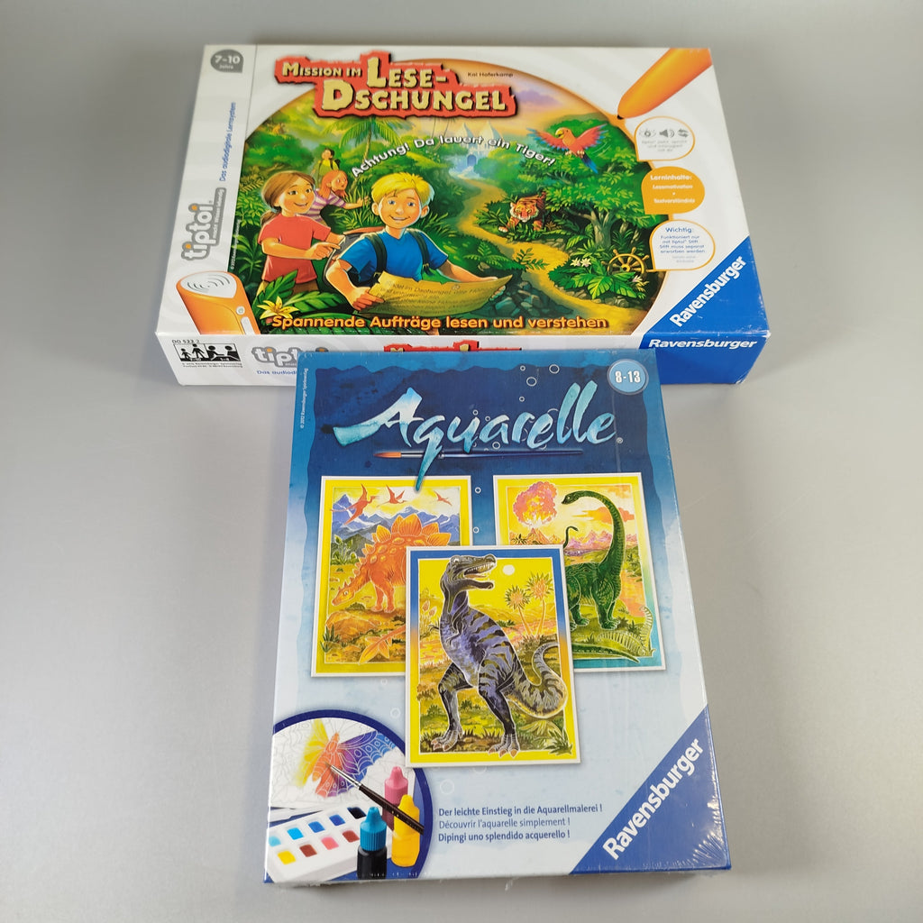 Hol dir das Ravensburger Bildungsspiele-Set und fördere die Kreativität und Lesefähigkeit der Kinder. Dieses Set enthält das interaktive Tiptoi Spiel 'Mission im Lesedschungel', komplett mit Tiptoi Stift und einem thematisch passenden Spielbrett. Dazu gehört auch der brandneue 'Aquarelle' Malset im Dinosaurier-Thema, inklusive vorgedruckter Aquarell-Bögen und Farben. Gib diesem Spielzeug ein neues Zuhause und erleben Sie strahlende Kinderaugen! Der Zustand des Sets ist teils neuwertig, teils gebraucht und es kommt teilweise in Originalverpackung. Hinweis: Nicht für Kinder unter 3 Jahren geeignet, da Kleinteile verschluckt werden können.
