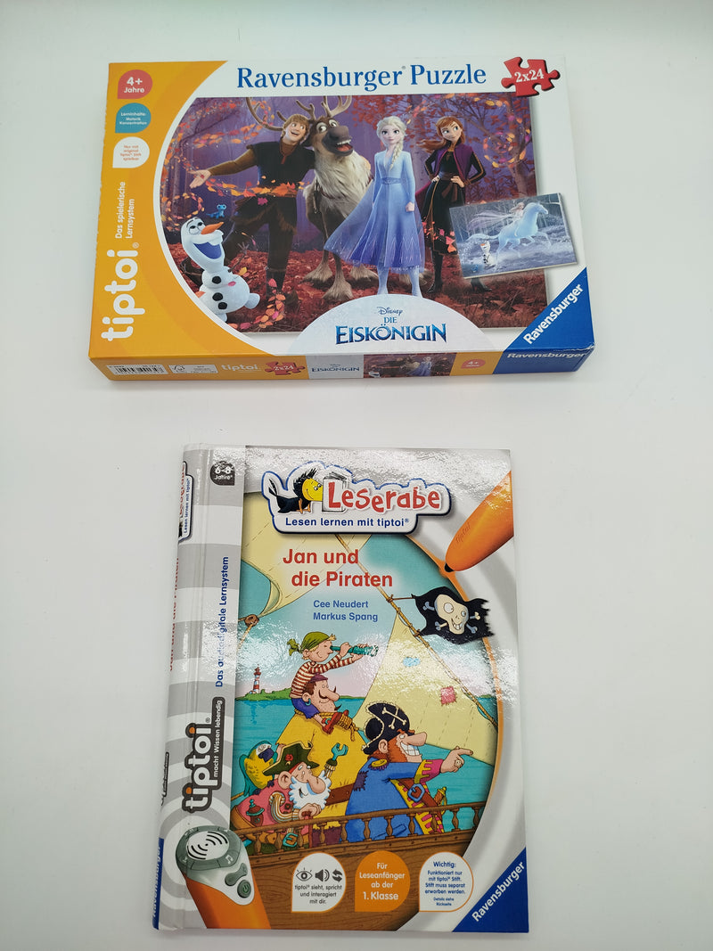 Hol dir das Ravensburger Puzzle-Set mit dem spannenden Disney Die Eiskönigin-Thema und dem interaktiven Leserabe-Buch "Jan und die Piraten"! Dieses Set, perfekt für die Kleinen ab 4 Jahren, umfasst zwei 24-teilige Puzzles und ein Tiptoi-kompatibles Buch für interaktives Lernen und Spaß. Die Puzzle-Stücke sowie die Verpackung weisen nur minimale Gebrauchsspuren auf, sind aber vollständig und gut erhalten. Gib diesem Spielzeug ein neues Zuhause und bringe Spannung und Bildung ins Kinderzimmer! Hinweis: Enthält Kleinteile, nicht geeignet für Kinder unter 3 Jahren. Erstickungsgefahr!