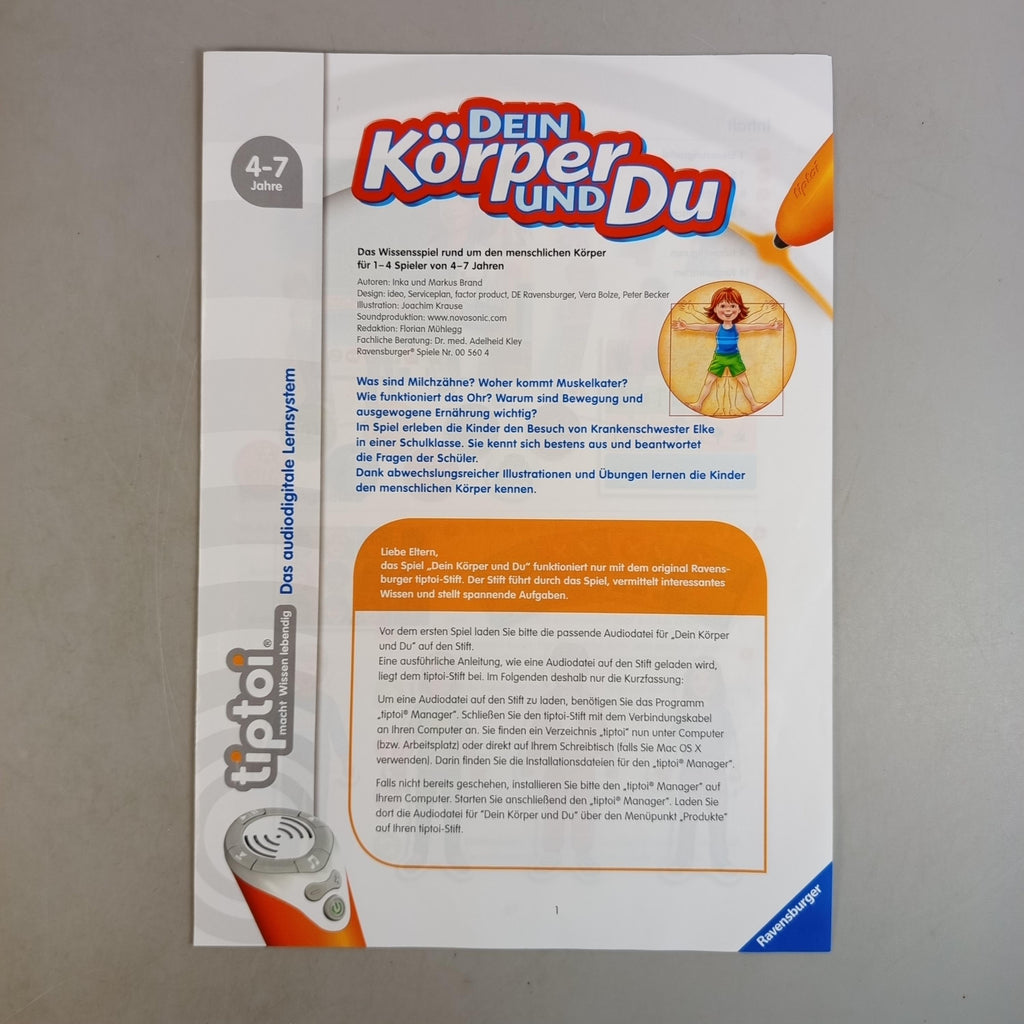 Ravensburger TipToi Buch "Dein Körper und Du – 00560" vermittelt Wissen rund um den menschlichen Körper für Kinder. Das audiodigitale Lernsystem unterstützt Kinder dabei, Themen wie Sinne, Gesundheit, Anatomie, Gefühle und Ernährung spielerisch zu erkunden und fördert dabei Konzentration sowie Verständnis für Körperfunktionen. Altersempfehlung: 3–5 Jahre. Hinweis: Nicht für Kinder unter 3 Jahren geeignet.