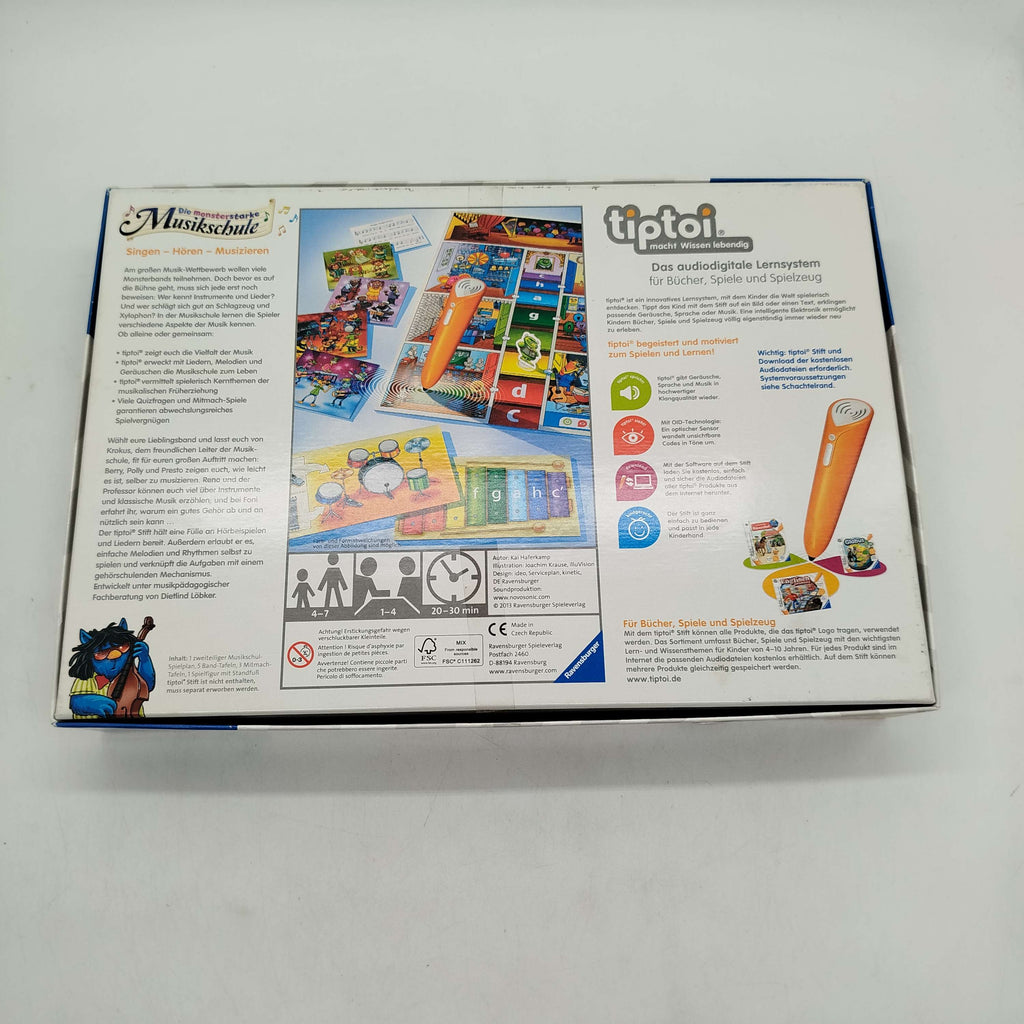 Ravensburger tiptoi Buch „Die monsterstarke Musikschule – 00555“ bietet ein interaktives Lernspiel rund um Musik und Monster. Kinder entdecken musikalische Inhalte durch Singen, Hören und Musizieren, unterstützt durch verschiedene Spielkarten und eine xylophonartige Spieltafel mit Noten. Der tiptoi Stift ist für die Nutzung erforderlich, aber nicht enthalten. Altersempfehlung: 4–7 Jahre. Für Kinder geeignet; verschluckbare Kleinteile, Erstickungsgefahr.
