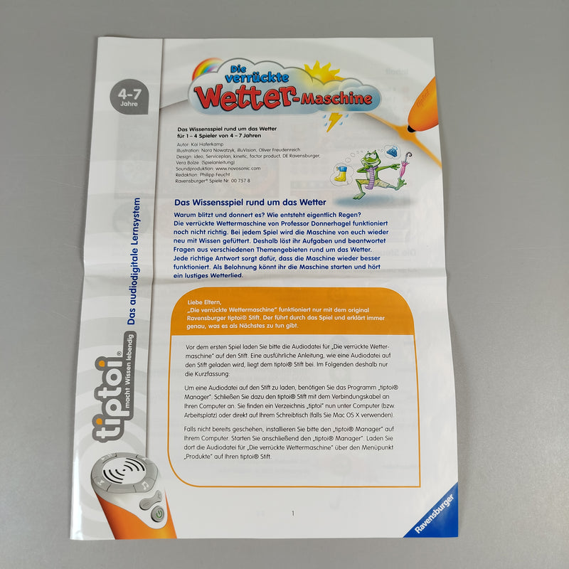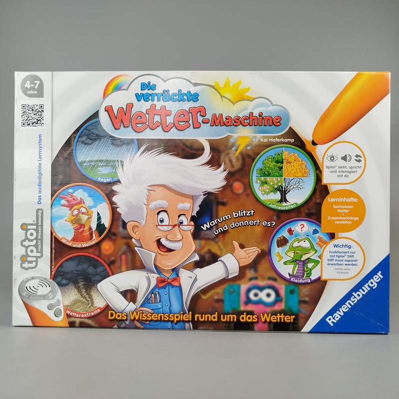 Hol dir das spannende Bildungsspiel 'Die verrückte Wetter-Maschine' von Ravensburger aus der tiptoi Serie! Dieses interaktive Lernspiel entführt Kinder in die faszinierende Welt des Wetters und fördert spielerisch das Verständnis von Regen, Wind, Wolken, Wetterextremen, Jahreszeiten und der passenden Kleidung. Perfekt für 1 bis 4 Spieler im Alter von 4 bis 7 Jahren, bietet die wetterverrückte Maschine mit ihrem bunten Spielbrett und spannenden Aufgaben viel Lernspaß. Gib diesem Spielzeug ein neues Zuhause und erlebe die Freude in den Augen der kleinen Entdecker! Hinweis: Enthält Kleinteile, nicht geeignet für Kinder unter 3 Jahren. Erstickungsgefahr!