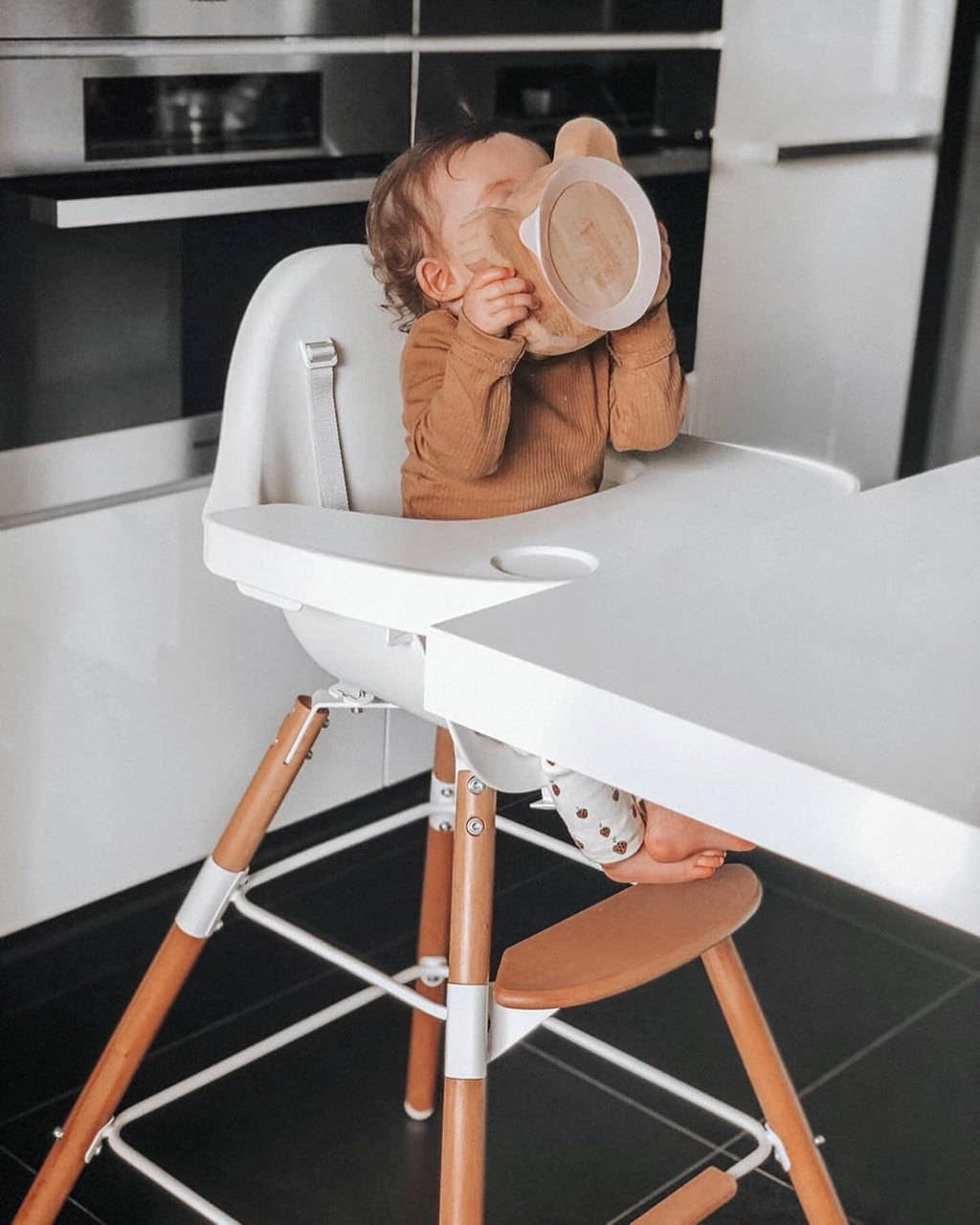 Dieser trendige 2-in-1-Hochstuhl kann auf zwei Tischhöhen eingestellt werden: ein Standard-Esstisch von 75 cm und ein Kindertisch von 50 cm: Ein Satz extra langer Beine ist optional erhältlich, um die Höhe des Hochstuhls an eine Kücheninsel von 90 cm anzupassen. Einfache Montage. Der Hochstuhl ist mit einem 5-Punkt-Sicherheitsgurt und einem abnehmbaren Bügel ausgestattet, um die Sicherheit Ihres Kindes zu gewährleisten.