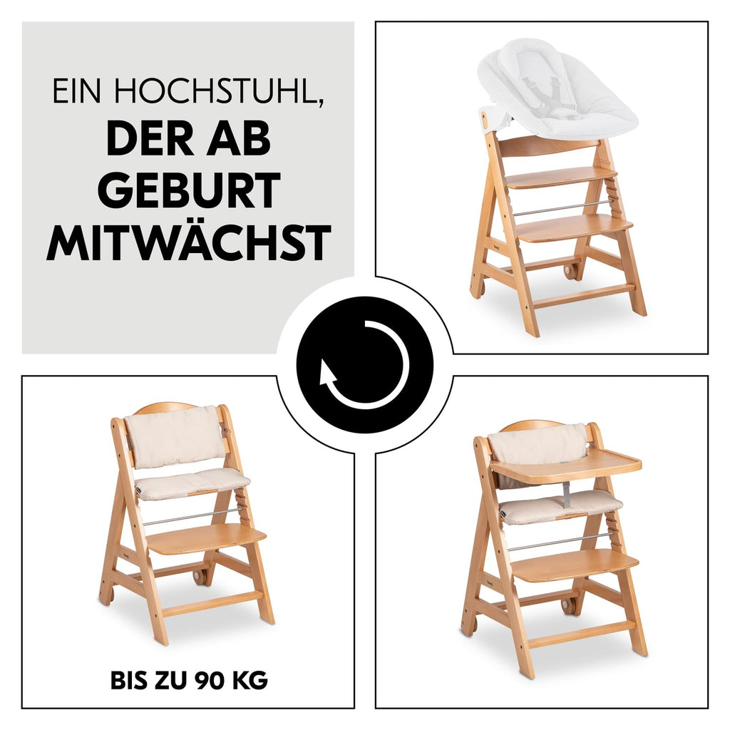 Das mitwachsende Hochstuhlset für jede Lebensphase Sicher, stabil und nachhaltig – aus hochwertigem Buchenholz Der Beta+ Hochstuhl wächst mit deinem Kind mit und begleitet es ein Leben lang. Gefertigt aus langlebigem, FSC®-zertifiziertem Buchenholz, steht er für Stabilität und nachhaltige Forstwirtschaft.Dank seiner stabilen Bauweise mit integrierten Rädern und Bodengleitern bleibt der Stuhl stets kippsicher. Sitz- und Fußplatte lassen sich flexibel anpassen – für Komfort vom Kleinkind- bis ins Erwachsenenalter (ab 6 Monaten bis 90 kg).Mehr Sicherheit und Komfort – direkt im Set enthalten Mit dem 5-Punkt-Gurt und dem Schrittgurt sitzt dein Liebling immer sicher. Der große Holztisch bietet viel Platz zum Essen und Spielen. Alternativ ersetzt du ihn durch den Schutzbügel (70 cm hoch), um den Kinderhochstuhl direkt an den Esstisch zu schieben. Die gepolsterte Sitzauflage sorgt für extra Bequemlichkeit.Flexible Erweiterungen für jede Lebensphase Mit den separat erhältlichen hauck Neugeborenenaufsätzen Highchair Bouncer und Alpha Bouncer (Premium, Deluxe oder 2in1) wird der Beta+ zum gemütlichen Babystuhl. Für extra Spaß kannst du den Hochstuhl mit dem hauck Play Tray und zahlreichen Spielaufsätzen erweitern. So wird der Beta+ nicht nur zum Essplatz, sondern auch zur unterhaltsamen Spielstation!Praktische Ordnung hingegen schafft die Highchair Box S Aufbewahrungsbox.