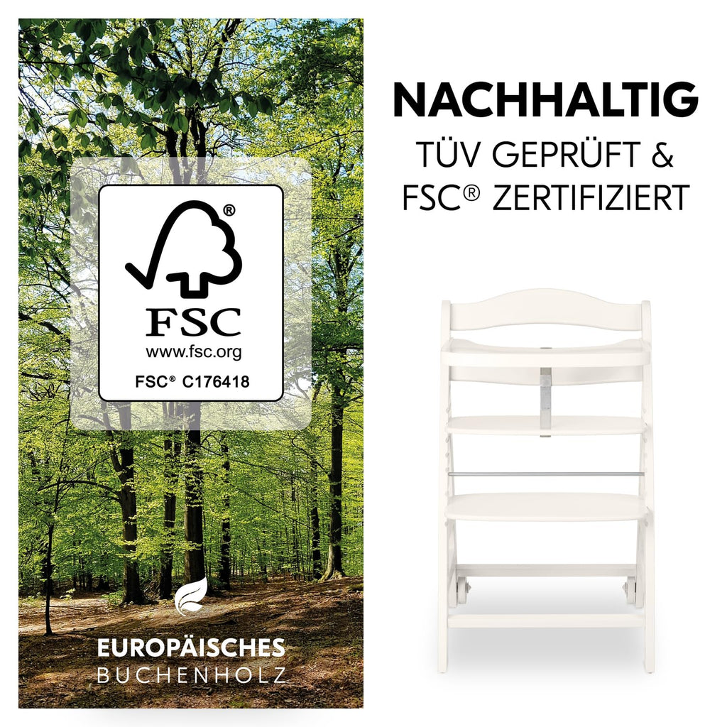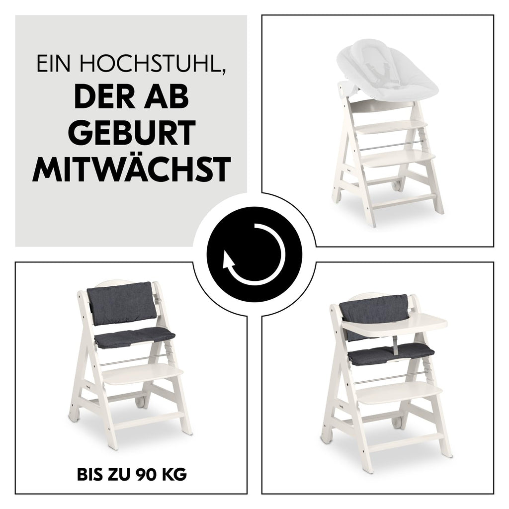 Das mitwachsende Hochstuhlset für jede Lebensphase Sicher, stabil und nachhaltig – aus hochwertigem Buchenholz Der Beta+ Hochstuhl wächst mit deinem Kind mit und begleitet es ein Leben lang. Gefertigt aus langlebigem, FSC®-zertifiziertem Buchenholz, steht er für Stabilität und nachhaltige Forstwirtschaft.Dank seiner stabilen Bauweise mit integrierten Rädern und Bodengleitern bleibt der Stuhl stets kippsicher. Sitz- und Fußplatte lassen sich flexibel anpassen – für Komfort vom Kleinkind- bis ins Erwachsenenalter (ab 6 Monaten bis 90 kg).Mehr Sicherheit und Komfort – direkt im Set enthalten Mit dem 5-Punkt-Gurt und dem Schrittgurt sitzt dein Liebling immer sicher. Der große Holztisch bietet viel Platz zum Essen und Spielen. Alternativ ersetzt du ihn durch den Schutzbügel (70 cm hoch), um den Kinderhochstuhl direkt an den Esstisch zu schieben. Die gepolsterte Sitzauflage sorgt für extra Bequemlichkeit.Flexible Erweiterungen für jede Lebensphase Mit den separat erhältlichen hauck Neugeborenenaufsätzen Highchair Bouncer und Alpha Bouncer (Premium, Deluxe oder 2in1) wird der Beta+ zum gemütlichen Babystuhl. Für extra Spaß kannst du den Hochstuhl mit dem hauck Play Tray und zahlreichen Spielaufsätzen erweitern. So wird der Beta+ nicht nur zum Essplatz, sondern auch zur unterhaltsamen Spielstation!Praktische Ordnung hingegen schafft die Highchair Box S Aufbewahrungsbox.