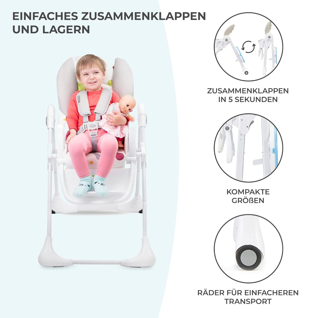 SICHER: Es ist mit verstellbaren 5-Punkt-Gurten mit Polstern ausgestattet, die leicht gereinigt werden können. Er verfügt über eine stabile Konstruktion und erfüllt die Norm EN 14988:2017 für Fütterungsstühle