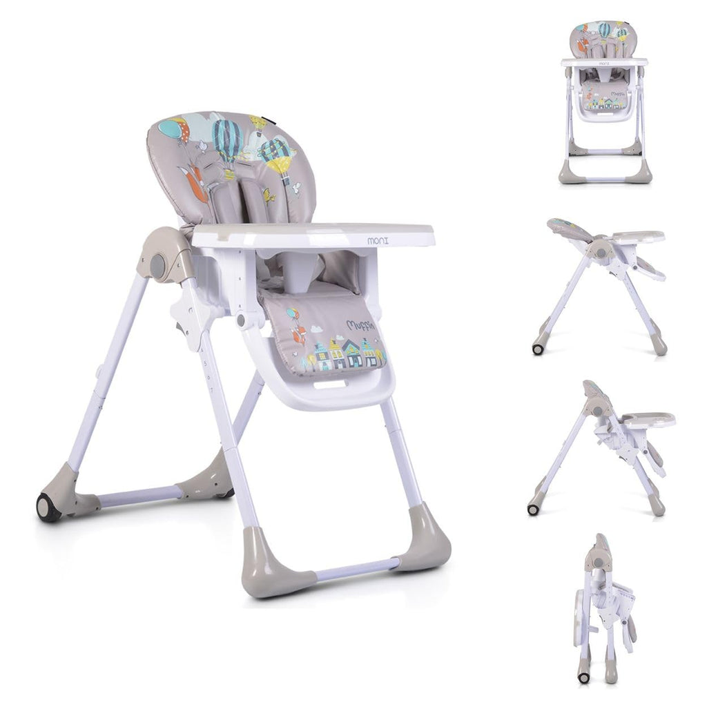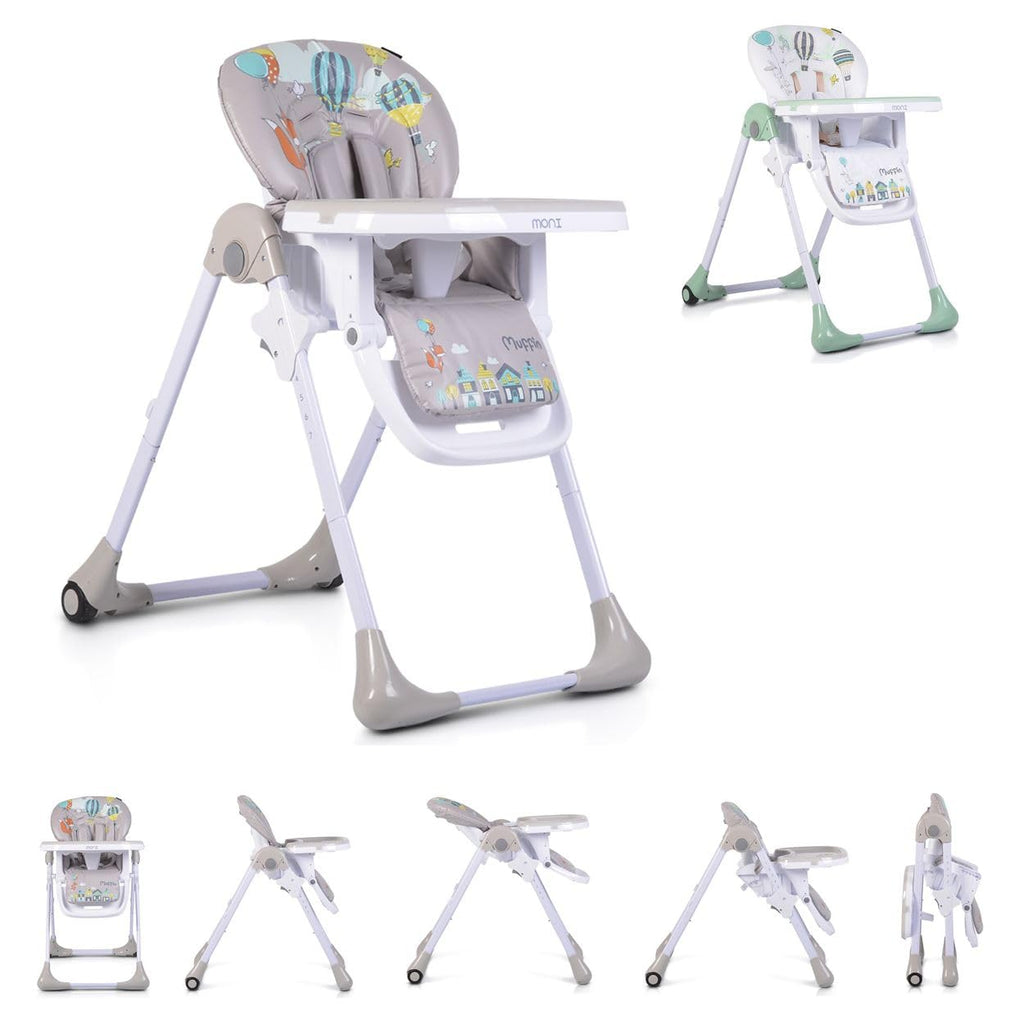 Der Hochstuhl Muffin von Moni, ist praktisch zu verwenden, funktional und kompakt. Für Kinder ab 6 Monaten bis ca. 3 Jahre und einem Maximalgewicht von 15 kg empfohlen. Die Rückenlehne lässt sich bis zu 145° verstellen, perfekt um ein Nickerchen zu machen. Mit diesem Kinderhochstuhl machen gemeinsames Essen und Spielen noch mehr Spaß. Die Höhe lässt sich in 7 verschiedene Positionen verstellen. Sicherheit steht an erster Stelle, daher verfügt der Kinderhochstuhl über den 5-Punkt-Sicherheitsgurt. Der Bezug des Kindersitzes, sowie der Tisch ist abwaschbar. Mit den 2 Rädern, lässt sich der Hochstuhl leicht von einer Stelle zur anderen bewegen.Besonderheiten Artikel Moni Hochstuhl Muffin klappbar, 5-Punkt-Sicherheitsgurt, Rückenlehne verstellbar:Hochstuhlfür Kinder von ca. 6 Monaten bis 3 Jahren empfohlenIhr Kind sollte selbstständig sitzen könnenMaximalgewicht 15 kgleicht zusammenklappbargroße Sitzfläche mit herausnehmbarem PolsterHöhenposition 7-Fach verstellbarTisch 2-teilig mit Bechervertiefung, abwaschbar in 3 Positionen verstellbargepolsterter Sitz aus hochwertigen MaterialienRückenlehne dreifach verstellbar bis zu einem Winkel von 145°2 Räder für einfaches Bewegen5-Punkt-SicherheitsgurtWeitere Informationen zum Artikel Moni Hochstuhl Muffin klappbar, 5-Punkt-Sicherheitsgurt, Rückenlehne verstellbar:Gewicht des Hochstuhles: 8,22 kgVersandgewicht: 9,22 kgMaße Hochstuhl: L 84 x B 55 x H 106 cmProduktgröße gefaltet: L 94 x B 54 x H 32 cmKartongröße: L 61,5 x B 52 x H 34 cmMaterial Bezug: 100% Polyvinylchlorid (PVC)Material Füllung: 100% Polyester