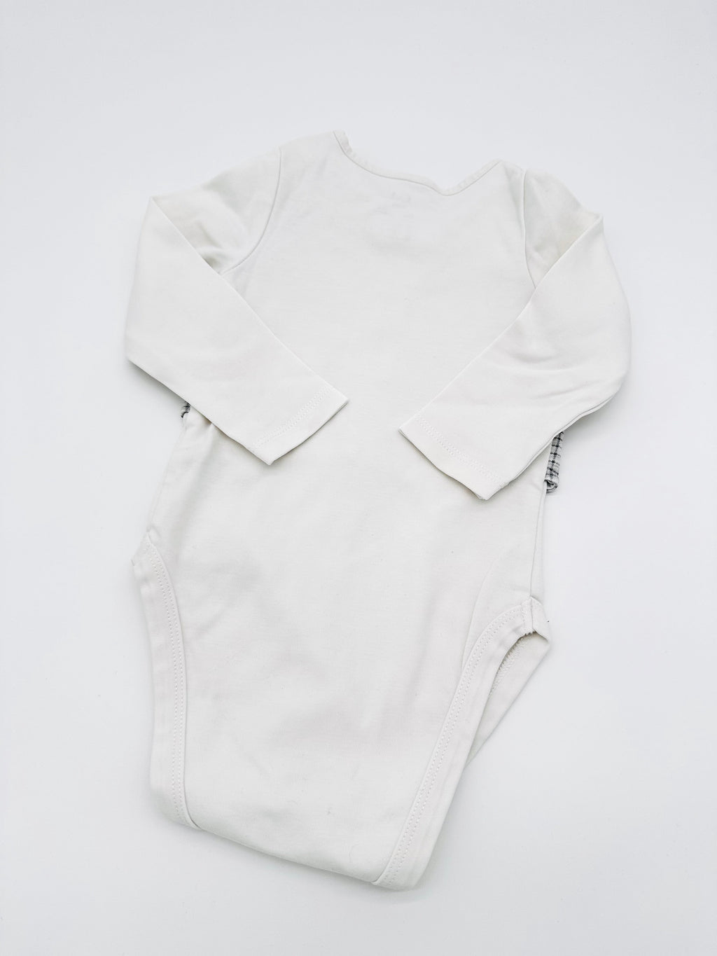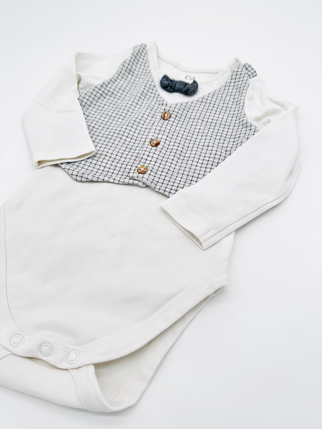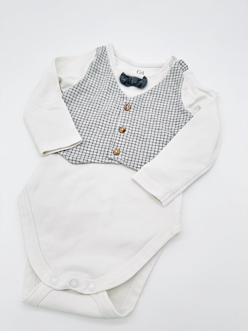 Eleganter und zugleich alltagstauglicher Babybody von C&A in klassischem Cremeweiß mit aufgesetzter Westen-Optik. Das feine Karomuster, die kleinen Knöpfe und die dekorative Fliege verleihen dem Body einen besonders stilvollen Look – ideal für besondere Anlässe oder schickere Alltagsoutfits.