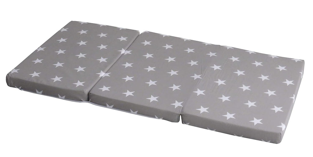 Produktbeschreibung Die roba Reisebettmatratze Little Stars passt mit einem Matratzen-Maß von 60 x 120 in alle gängigen Reise- & Babybetten. Der Matratzenkern aus getestetem & hochwertigen PU-Schaum mit einer Höhe von 5,5 sorgt für einen hohen Liegekomfort und garantiert einen erholsamen Schlaf von Geburt an. Die Kindermatratze ist vielseitig einsetzbar und findet unterwegs als komfortable Babybett-Ausstattung im Reisebett oder im Kinderzimmer als Sitzhocker und Spielmatratze lange Verwendung. Ebenso eignet sich die Matratze für einen Besuch kleiner Übernachtungsgäste. Auf Reisen oder unterwegs lässt sich die Matratze 2-fach auf 40 x 60 falten und in der praktischen, staubsicheren Transporttasche platzsparend verstauen. So bleibt sie hygienisch sauber und lässt sich einfach tragen. Der weiche und atmungsaktive Bezug aus strapazierfähiger Baumwolle in grau mit weißen Sternen ist durch einen Reißverschluss leicht abnehmbar und bei 30° waschbar. Alle verwendeten Materialien der Reisebettmatratze sind schadstoffgeprüft und zertifiziert. Die 2-fach faltbare roba Reisebettmatratze Little Stars mit Baumwoll-Bezug hat aufgeklappt die Maße 120 x 60 x 5,5 , geschlossen ist sie 40 x 60 groß. Warnhinweise Nicht bleichen oder chemisch reinigen