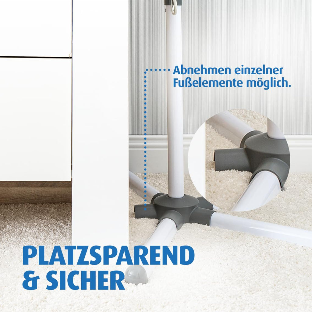 Einzelne Elemente des Fußes lassen sich entfernen. Das erlaubt ein besonders platzsparendes Aufstellen ganz dicht am Wickeltisch. Für zusätzliche Sicherheit sorgt die Kippsicherung. Neigt sich der Heizstrahler zu stark, schaltet das Gerät automatisch ab, bis es wieder in eine aufrechte Position gebracht wird. Set enthält: 1 x Wickeltischwärmestrahler EasyHeat Flex