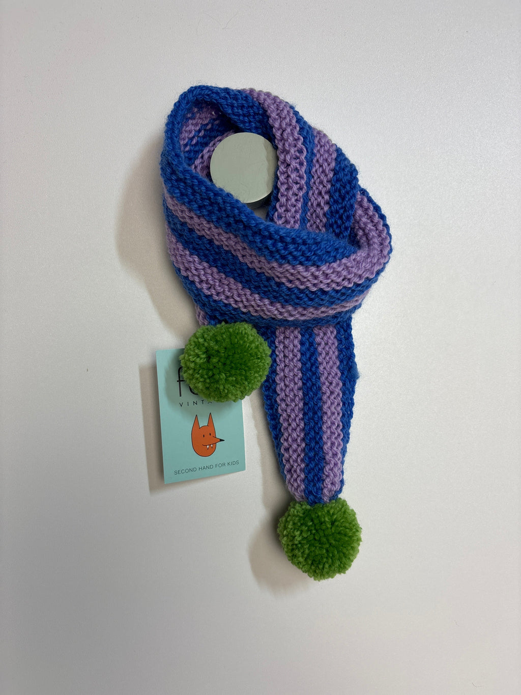 Längsgestrickt in lila blau mit grünem Bommel