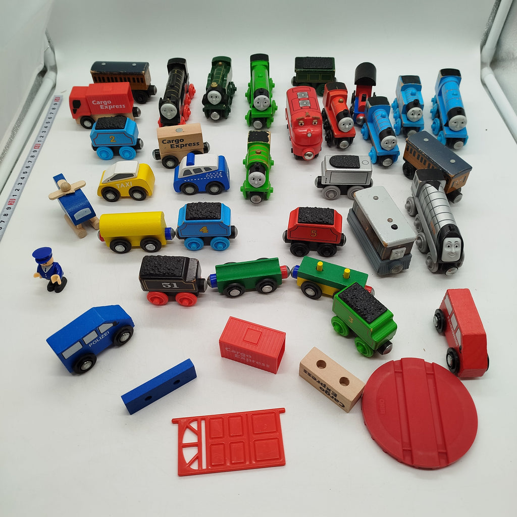 Hol dir das umfangreiche Holzeisenbahn-Konvolut von BRIO, Thomas & Friends und weiteren Marken wie IKEA. Das Konvolut enthält viele Schienen, Fahrzeuge, Brücken, Gebäude und Bäume. Des Weiteren sind etliche Lokomotiven enthalten. Ideal für kreatives Spielen und kleine Eisenbahn-Fans. Verpackung fehlt, aber der Zustand ist hervorragend mit nur leichten Gebrauchsspuren. Die Vollständigkeit konnte nicht überprüft werden. Hinweis: Enthält Kleinteile, nicht geeignet für Kinder unter 3 Jahren.