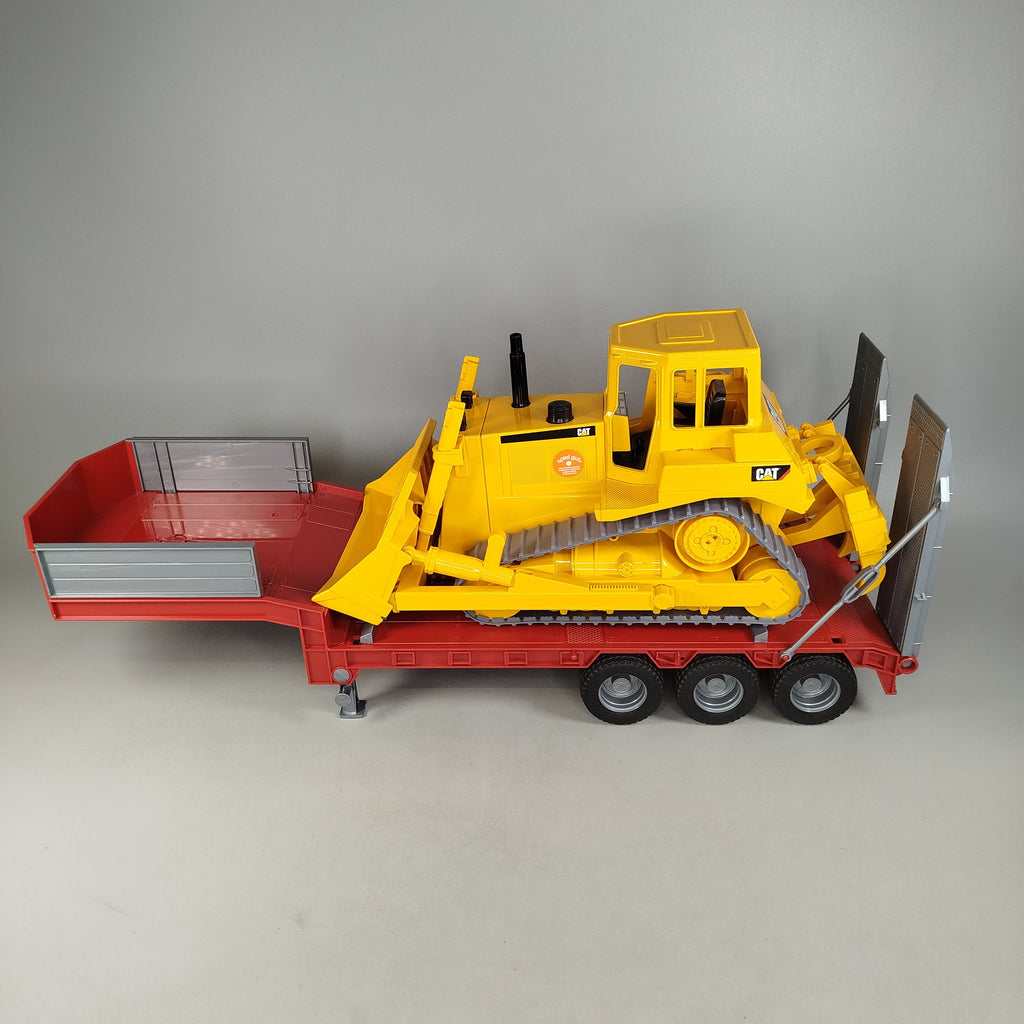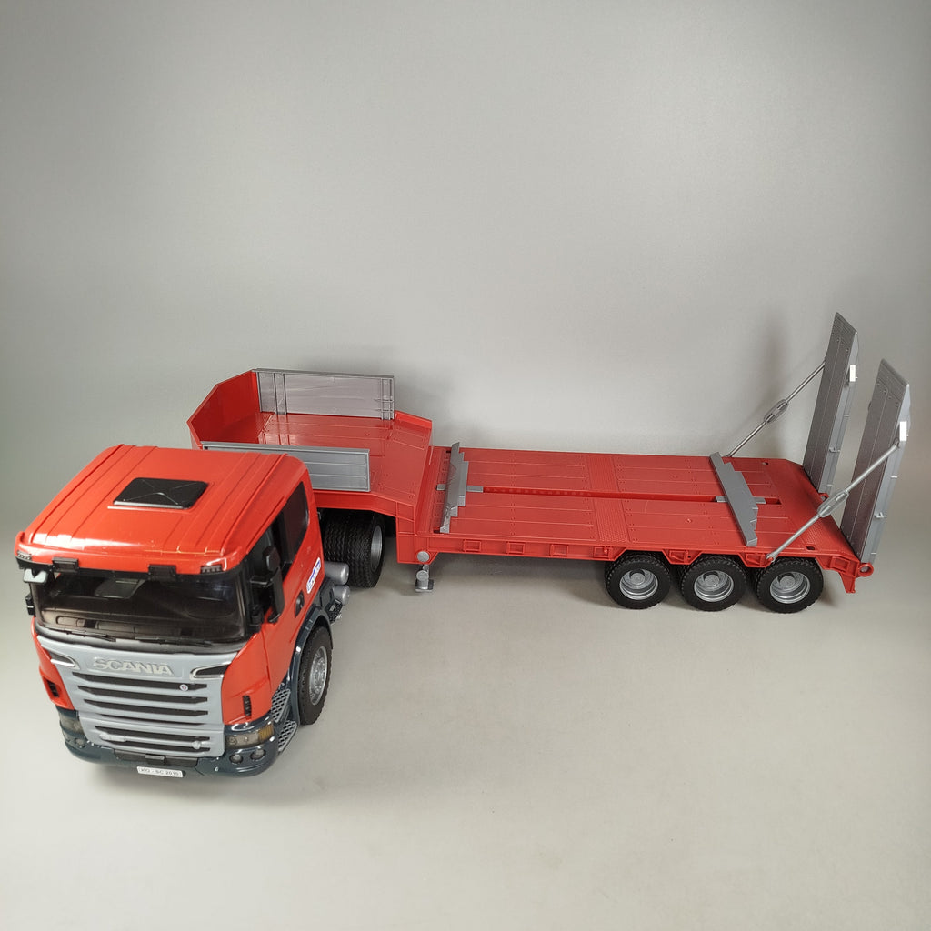 Hol dir das detailreiche Baustellen-Spielzeugfahrzeug bestehend aus einem roten Scania Zugfahrzeug mit Tieflader und einem gelben CAT Bulldozer, bei dem sich die Türen des LKW öffnen lassen und die Rampen des Tiefladers klappbar sind. Das Set ist anhand der sichtbaren Informationen vollständig mit genau diesen drei Fahrzeugen, der genaue Zustand lässt sich ohne weitere Hinweise nicht eindeutig beurteilen, sichtbare Beschädigungen sind jedoch nicht genannt. Eine Originalverpackung ist nicht erkennbar. Das Spielzeug eignet sich für realistisches Rollenspiel rund um Baustelle und Transport und bekommt als Second-Hand-Spielzeug ein nachhaltiges zweites Leben.