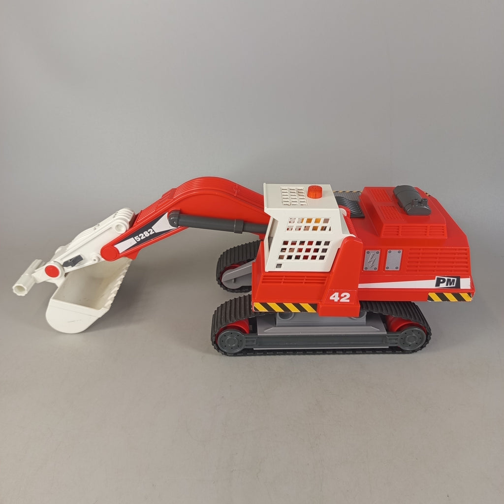 Playmobil Großer Kettenbagger 5282 ist ein Bauset mit einem roten und weißen Kettenbagger sowie einer Bauarbeiter-Figur mit gelbem Schutzhelm. Die Spielfigur und das Fahrzeug ermöglichen realitätsnahes Spielen auf der Baustelle und fördern Motorik und kreatives Rollenspiel. Altersempfehlung: 3–5 Jahre. Nicht für Kinder unter 3 Jahren geeignet, da Kleinteile verschluckt werden können.