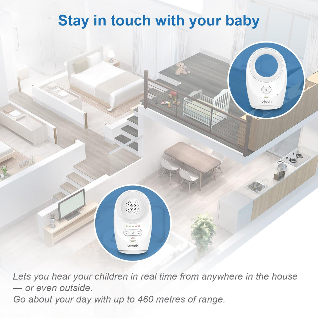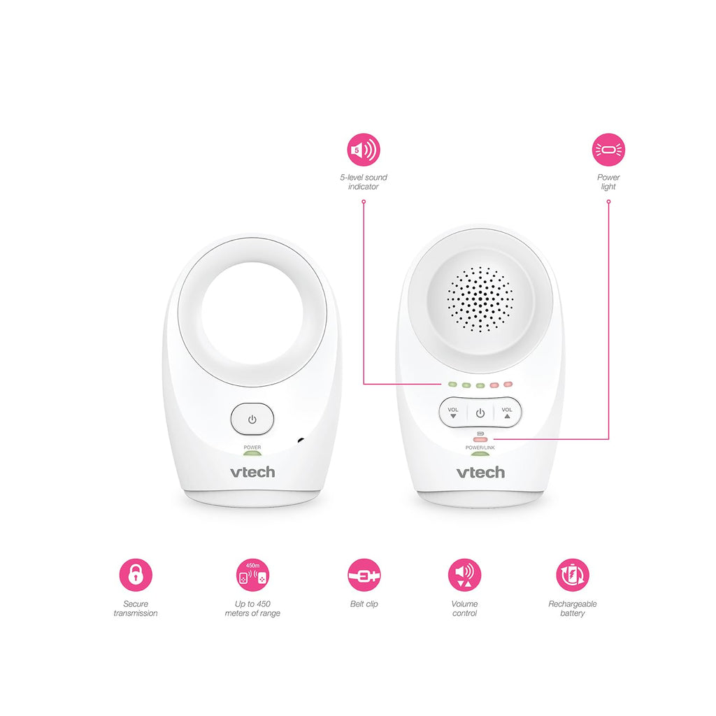 Safe & Sound – Babyphone Classic – BM 1120 – ab 0 Monaten mit digitaler Technologie ermöglicht ein hochwertiges Hören ohne Störungen oder Knistern, um in ständigem Kontakt mit dem Baby sicher zu bleiben. Reichweite bis zu 460 m im freien Feld (50 bis 60 m im Innenbereich). Elterneinheit: – Leiser Modus mit 5 LEDs zur Überwachung des Babys in aller Ruhe. Die Dioden leuchten je nach Geräuschintensität nacheinander. - Anzeige bei niedrigem Batteriestand und Babyeinheit außerhalb der Reichweite. - Gürtelclip - Lautstärkeregler Babyeinheit: – sehr geringe Wellen im Standby-Modus. - Hochempfindliches Mikrofon. Funktioniert mit wiederaufladbaren Batterien für die Elterneinheit (bis zu 14 Stunden Laufzeit) und Netzadapter für die Babyeinheit. 3 Jahre Garantie Geeignet ab der Geburt.