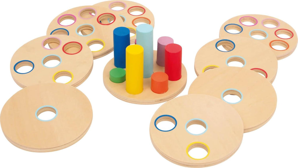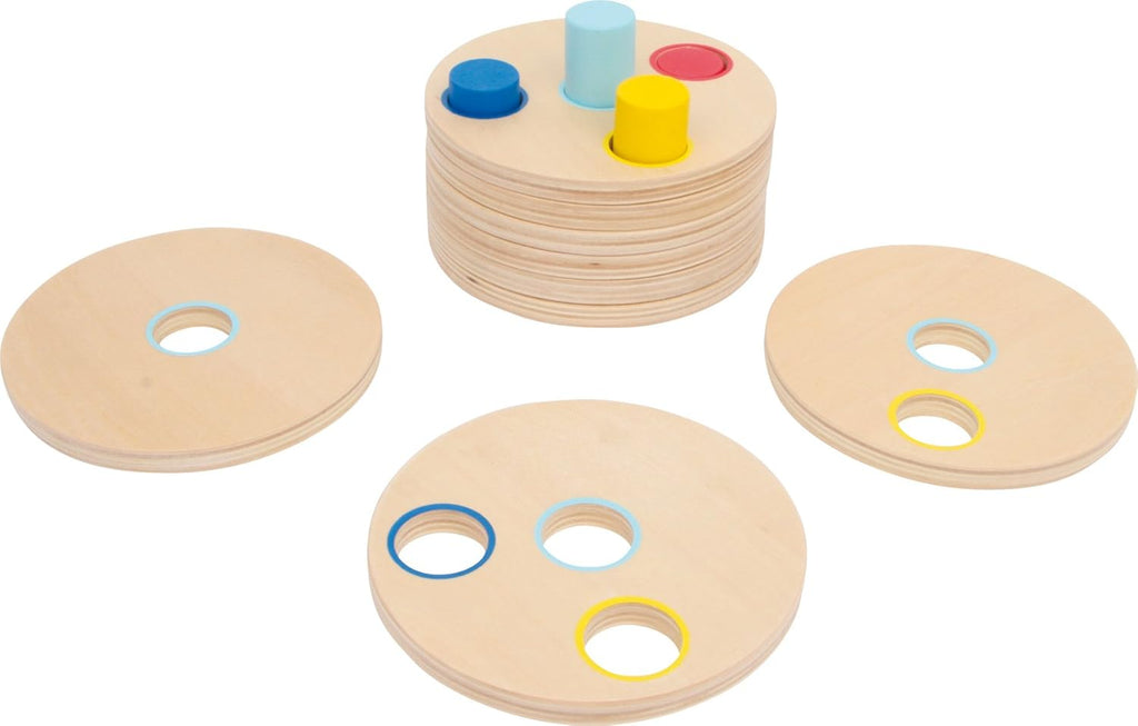 - Ein Steckspiel, das die Logik fördert, indem 8 Scheiben passend auf farbige Stäbe gesteckt werden sollen