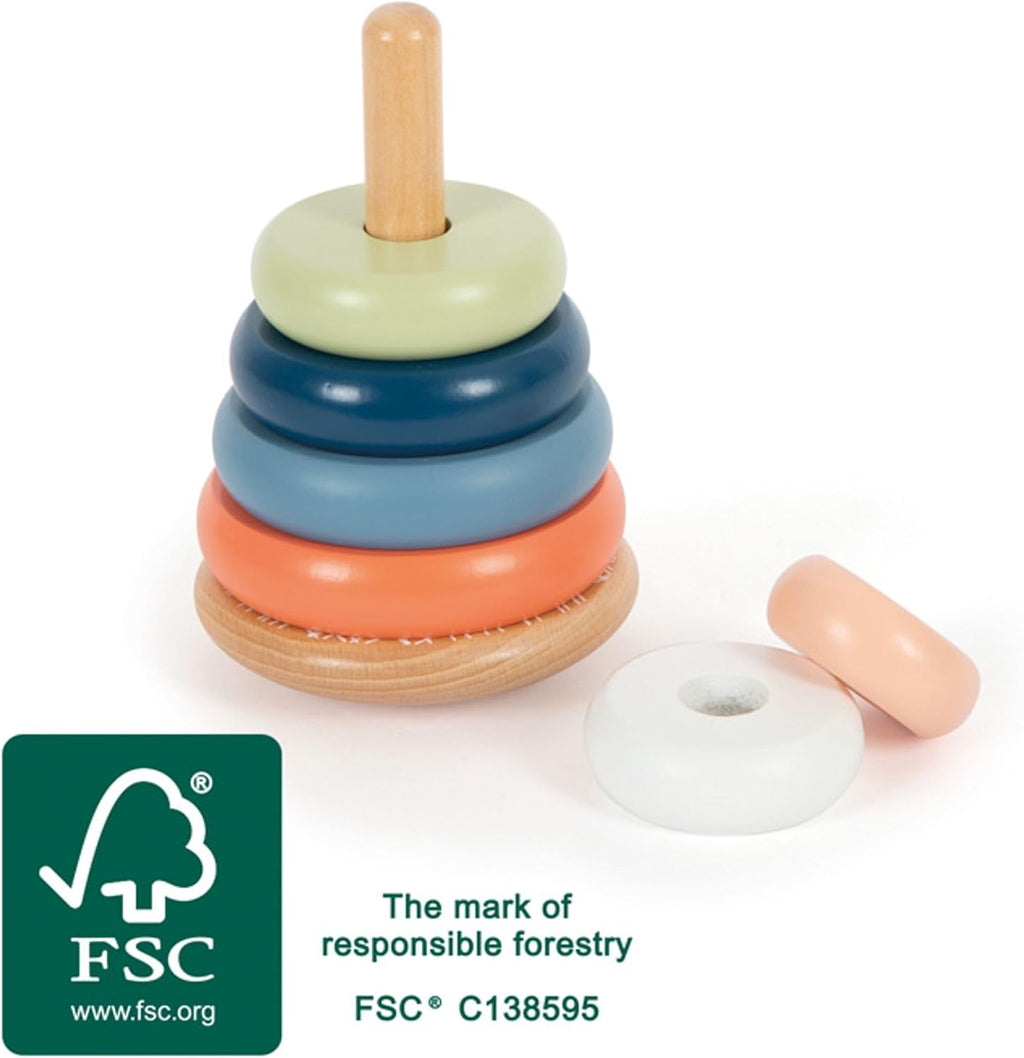 - mit 6 farbigen Holzringen zum Stapeln und Stecken