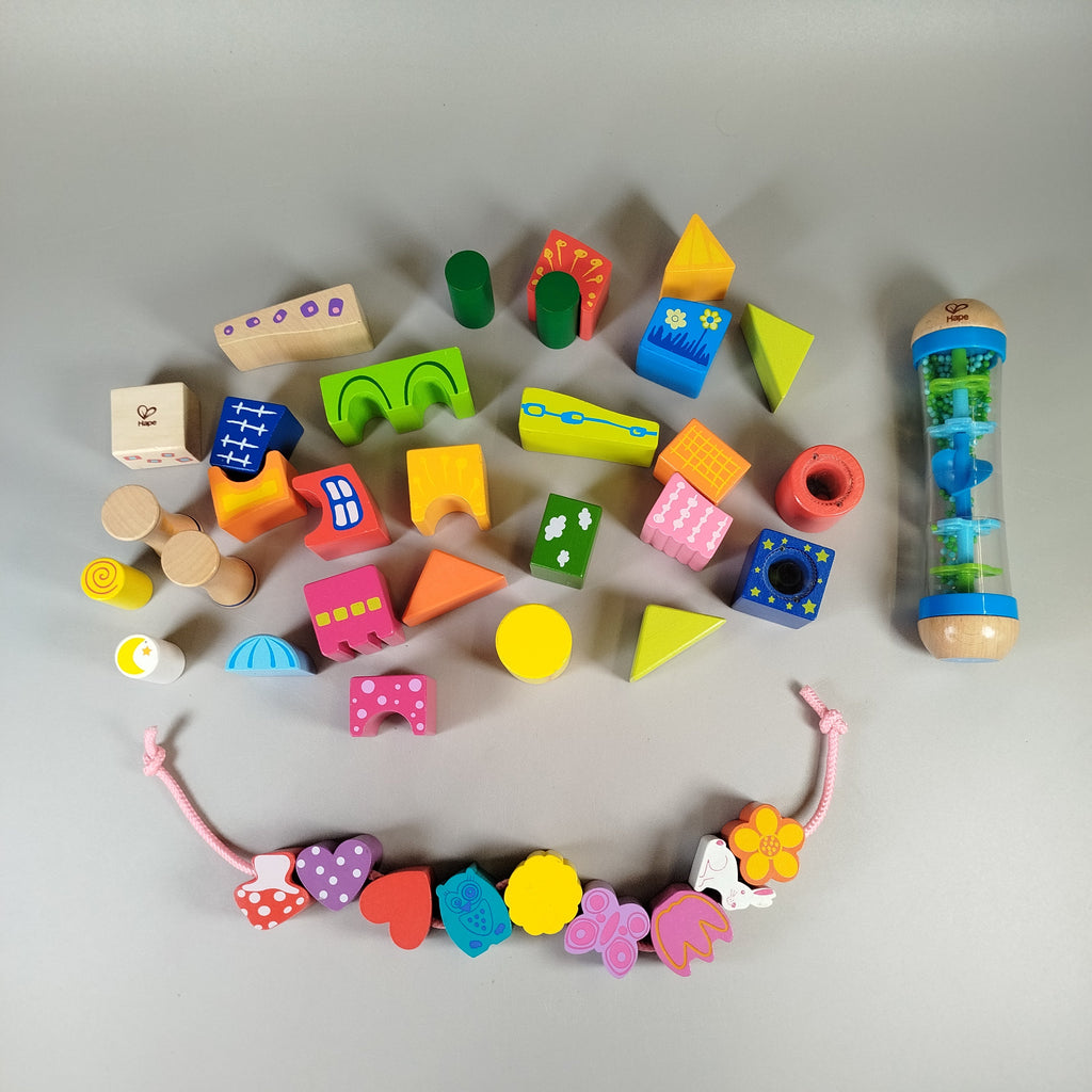 Hol dir das Holzspielzeug-Set für kreative Bauabenteuer der Qualitätsmarke Hape! Dieses Set enthält die "Fantasiebausteine Schloss" mit farbenfrohen Holzbausteine mit verschiedenen Formen und bemalten Mustern, eine Rainmaker Rassel für beruhigende Geräusche und eine Kette zum Auffädeln bunter Holzperlen. Das Set ist geeignet für Kinder ab 18 Monaten und fördert die Kreativität und Feinmotorik. Es befindet sich in einem guten bespielten Zustand mit Gebrauchsspuren. Die Hape-Bausteine kommen in ihrer Originalverpackung.
