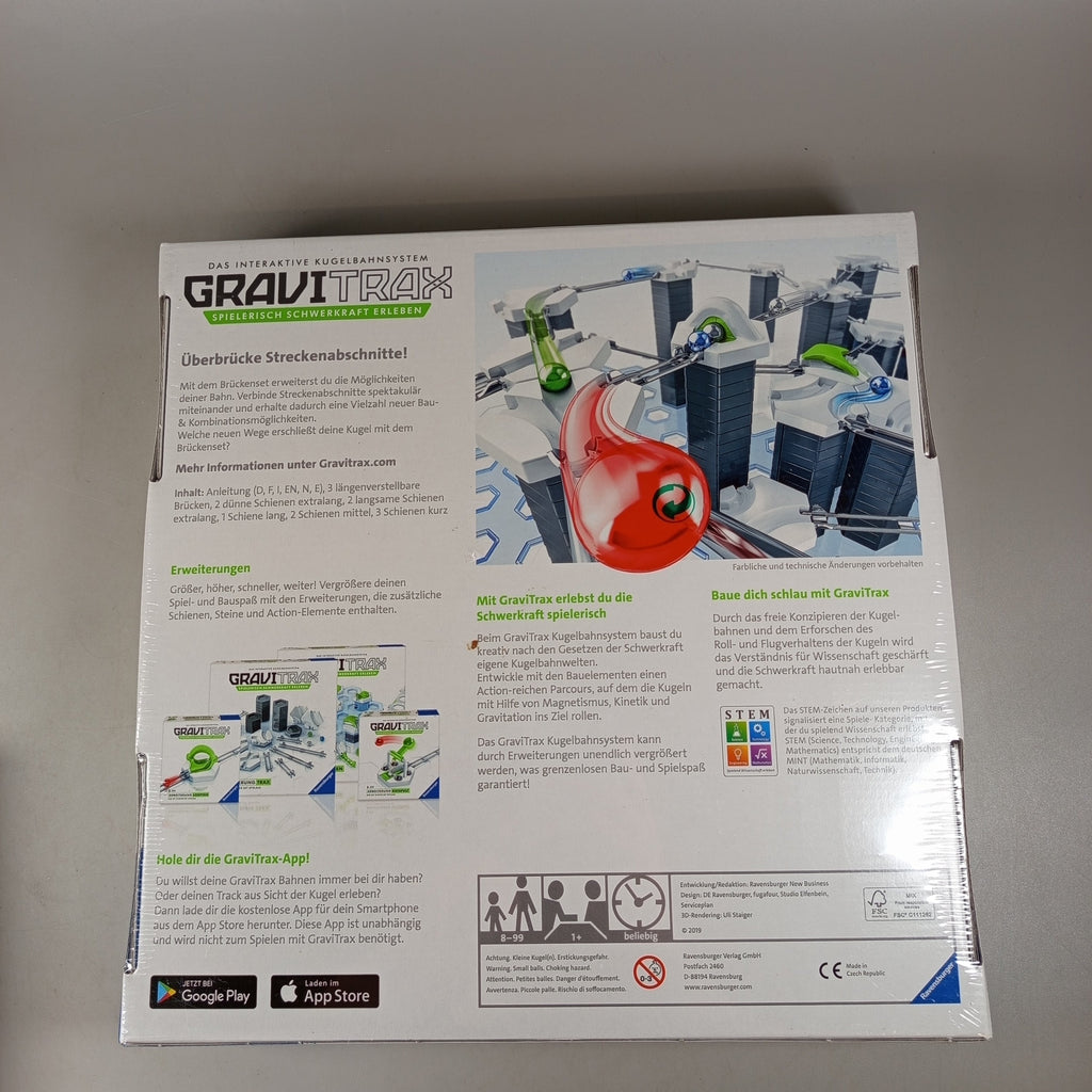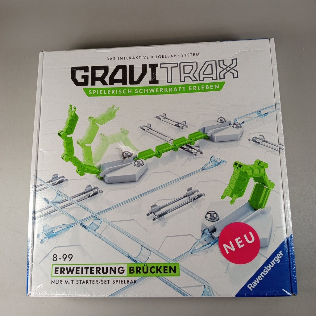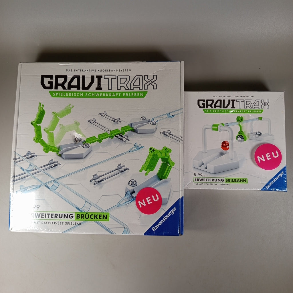 Hol dir die spannenden GraviTrax Erweiterungssets Brücken und Seilbahn und erweitere dein Kugelbahnsystem um neue Strecken und Höhen. Beide Sets enthalten Schienen und Zubehör für kreative Konstruktionen und sind nur mit einem GraviTrax Starter-Set spielbar. Ideal für technikbegeisterte Kinder ab 8 Jahren. Die Artikel befinden sich in gutem Zustand in Originalverpackung, Gebrauchsspuren sind kaum erkennbar. Die Vollständigkeit konnte nicht überprüft werden.