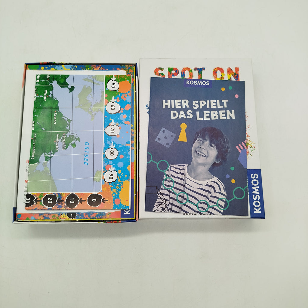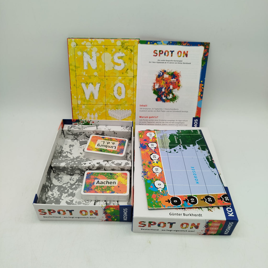 Hol dir das Geografiespiel Spot On: Deutschland – wo liegt eigentlich was? von KOSMOS und teste dein Wissen über Städte und Regionen. Gespielt wird mit einer Deutschlandkarte, Ortskarten und weiteren Spielelementen, bei denen Schätzen, Tippen und Staunen im Mittelpunkt stehen. Für 2–4 Spieler ab 10 Jahren mit einer Spieldauer von etwa 30 Minuten. Gib diesem Spielzeug ein neues Zuhause und verlängere seinen Lebenszyklus. Sicherheitshinweis gemäß GPSR: Enthält Kleinteile, nicht geeignet für Kinder unter 3 Jahren.