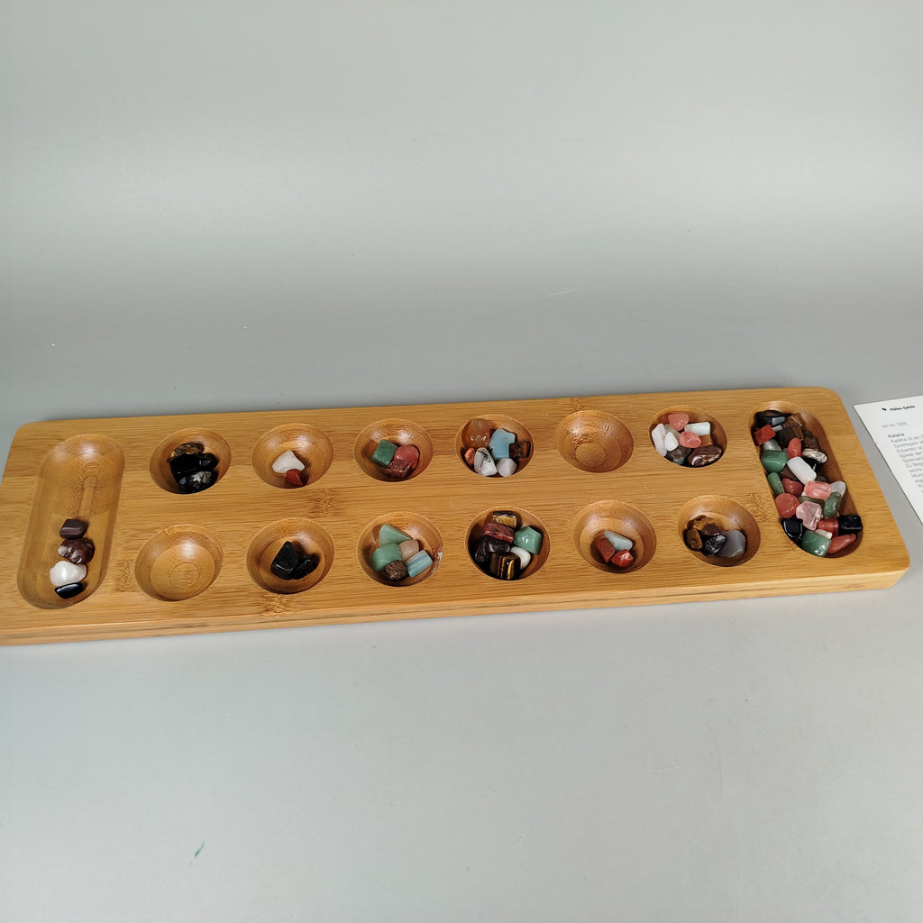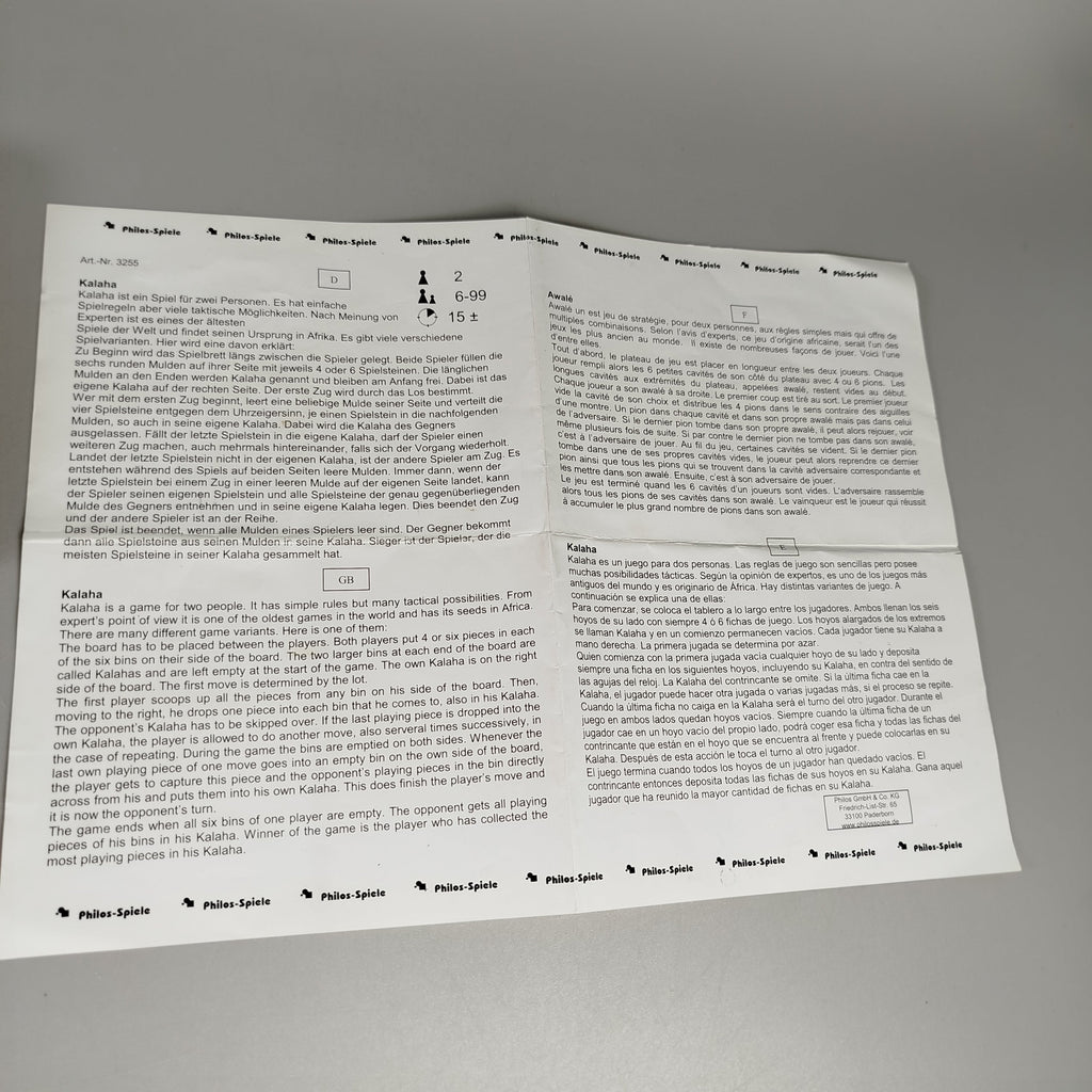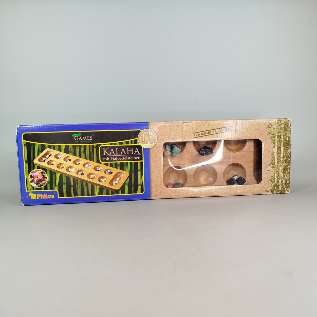 Hol dir das klassische Brettspiel Kalaha von Philos und fördere strategisches Denken! Dieses Spielset enthält ein formschönes Holzbrett mit 14 Spielmulden und halbedelsteinartige Spielsteine. Die Anleitung erklärt das Spiel in mehreren Sprachen, darunter Deutsch, Englisch, Französisch und Spanisch. Gib diesem Spiel ein zweites Leben und erlebe strahlende Kinderaugen! Das Spiel befindet sich in einem guten gebrauchten Zustand mit minimalen Gebrauchsspuren und kommt in der Originalverpackung, die leichte Gebrauchsspuren aufweist. Hinweis: Nicht für Kinder unter 3 Jahren geeignet, da Kleinteile verschluckt werden können. Altersempfehlung: für Spieler ab 6 Jahren.