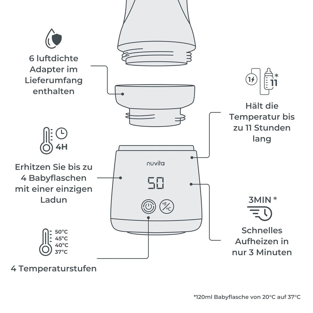 Nuvita 1163 Warm’n’Mix Tragbarer Flaschenwärmer mit Akku, mit Heiz- und Mischfunktion – Schnelles Aufheizen in 3 Minuten, 4 Temperatureinstellungen, Universelle Kompatibilität mit 6 Adaptern