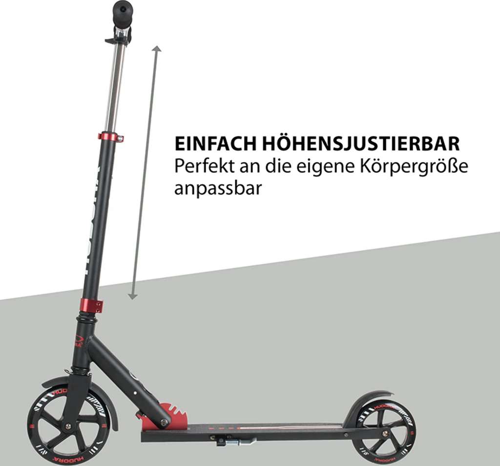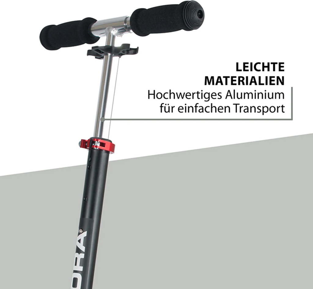 Hochwertiges Aluminium "ONE STEP EASY"-Klappmechanismus Aluminium Friktionsbremse inkl. Schmutzfang vorne Umklappbarer, höhenjustierbarer Lenker von 76 bis 100 cm mit Tube-Liner Ständer Maße: Länge ca. 91 cm Extra breites und langes Deck ca. 53,5 x 11 cm mit einer Trittfläche von ca. 33 x 11 cm High-Rebound-Rollen aus gegossenem PU, 82 A, vorne 180 mm Ø hinten 145 mm Ø Kugellager ABEC 7, PolyurethanHeavy-Duty Felgen Max. Benutzergewicht 100 kg