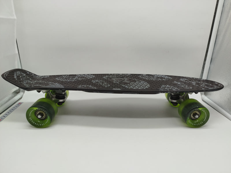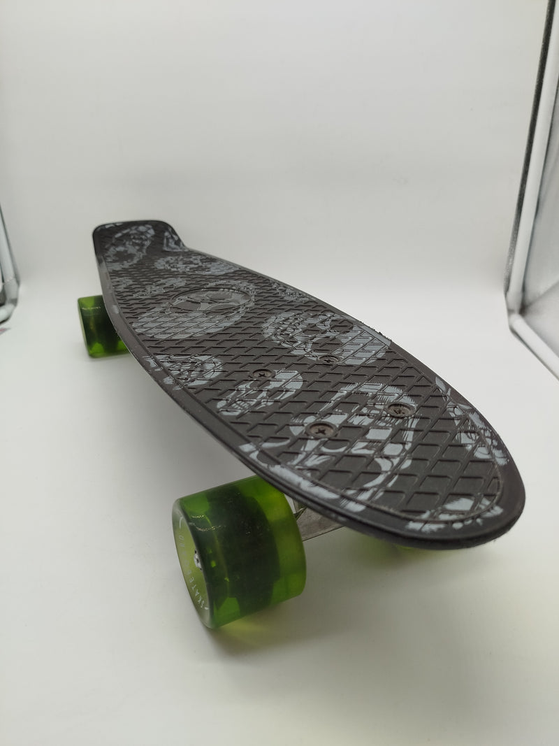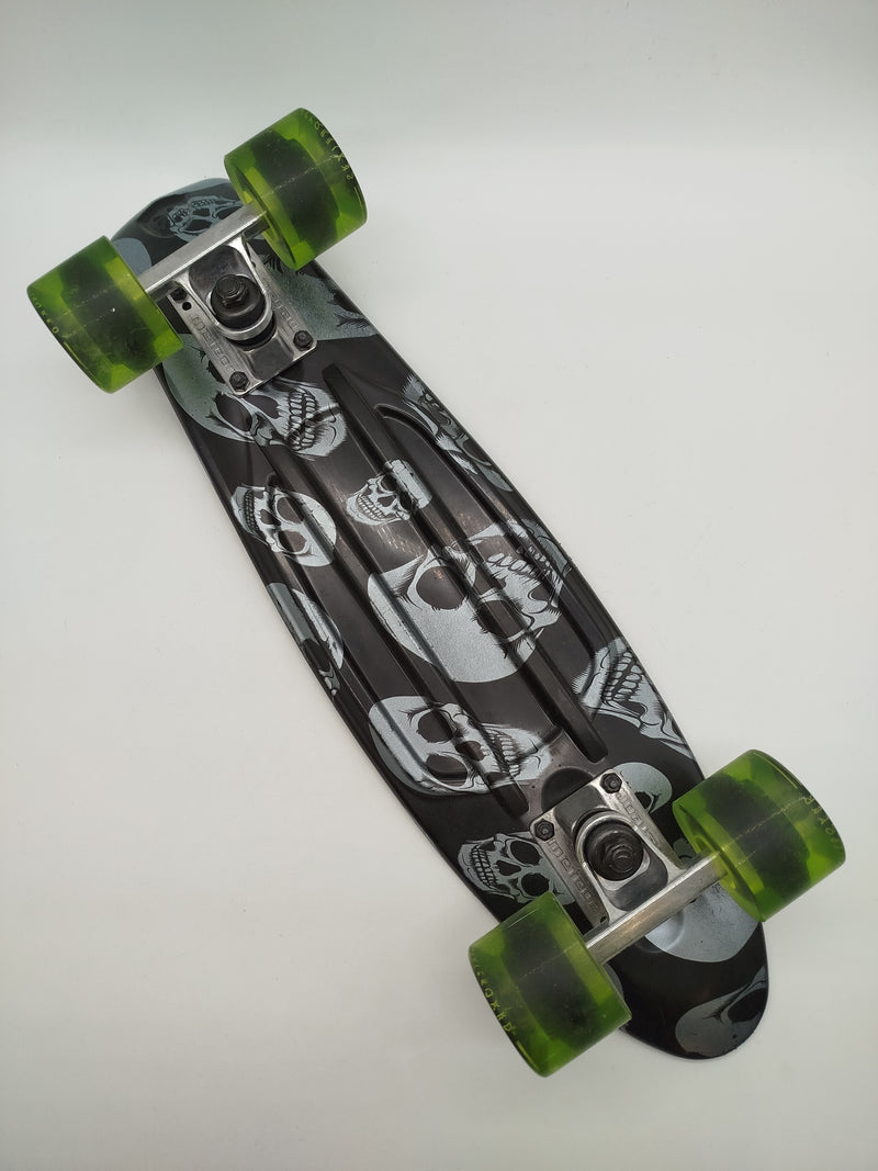 Hol dir das stylische Mini Cruiser Skateboard mit einem einzigartigen Totenkopf-Design! Dieses Skateboard bietet nicht nur ein visuelles Highlight mit seinen weißen und grauen Skulls auf schwarzem Grund, sondern auch ein flüssiges Fahrerlebnis dank der großen transparenten grünen Räder. Perfekt geeignet für Straßen und Parks, ist es in gutem gebrauchten Zustand mit leichten Gebrauchsspuren zu sehen. Ein erstklassiges Zweitlebensspielzeug, um in Bewegung zu bleiben und gleichzeitig die Umwelt zu schonen. Hinweis: keine Originalverpackung und die Anleitung ist nicht anwendbar.