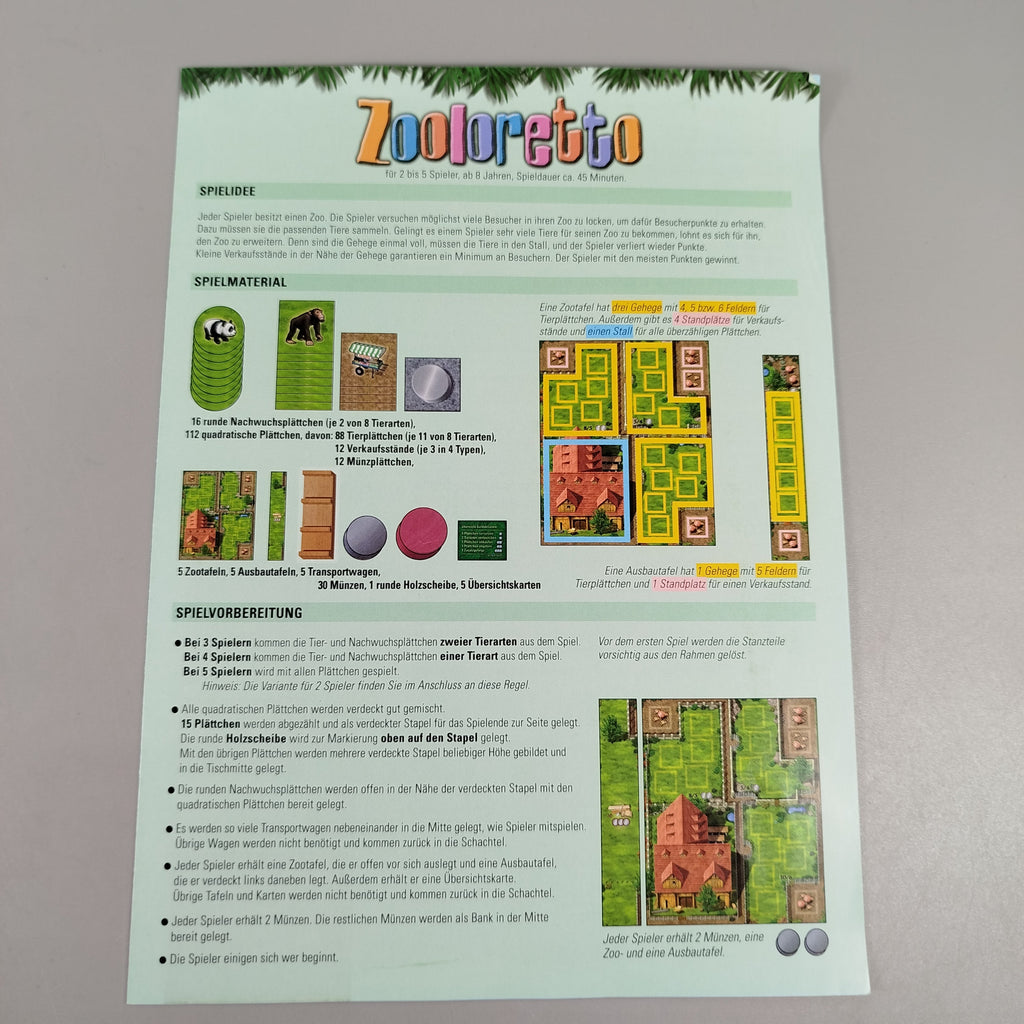 Hol dir das preisgekrönte Brettspiel Zooloretto von Abacusspiele und begebe dich in die Welt des Tierpark-Managements! Das Set ist vollständig und enthält Spielfelder, Spielsteine, Transportwagen, Münzen, Karten, Aufwertungsteile sowie das Regelheft im Originalzustand. Die Spielmaterialien sind neuwertig und zeigen keinerlei Gebrauchsspuren, nur die Verpackung weist leichte Abnutzung auf. Perfekt für Familienspieleabende ab 8 Jahren. Gib diesem beliebten Spiel ein neues Zuhause und erlebe stundenlangen Spielspaß!