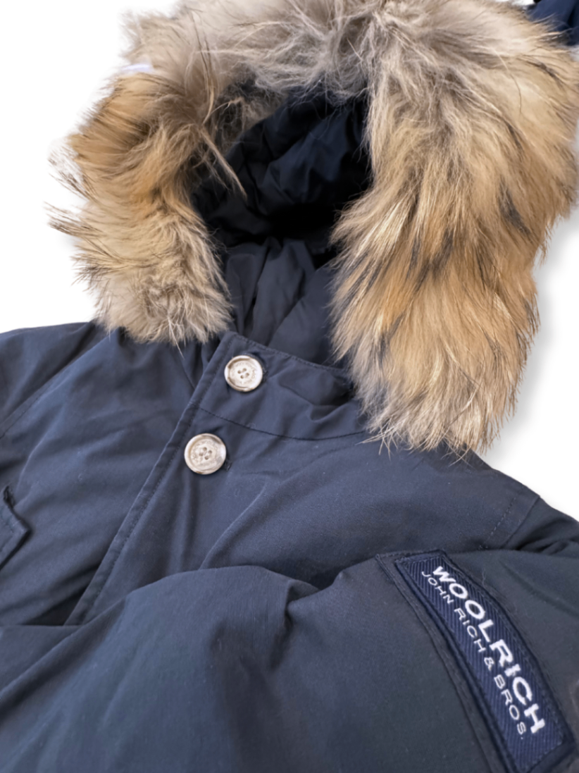 WOOLRICH - Ein klassischer Artic Parka in Dunkelblau, ideal für die kalten Wintertage. Die hochwertige Verarbeitung sorgt für angenehme Wärme und Komfort. Der stilvolle, abnehmbare Pelzbesatz verleiht dem Outfit einen luxuriösen Touch. Praktische Taschen bieten Platz für wichtige Utensilien und die dekorativen Knöpfe fügen ein elegantes Detail hinzu. Der Parka ist robust und strapazierfähig, perfekt für urbane Abenteuer. Ein Must-Have für alle, die stilvoll warm bleiben möchten.