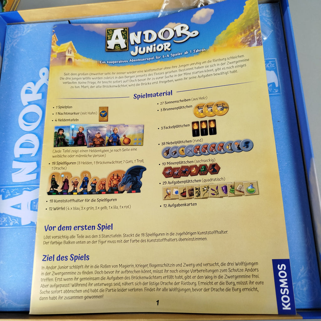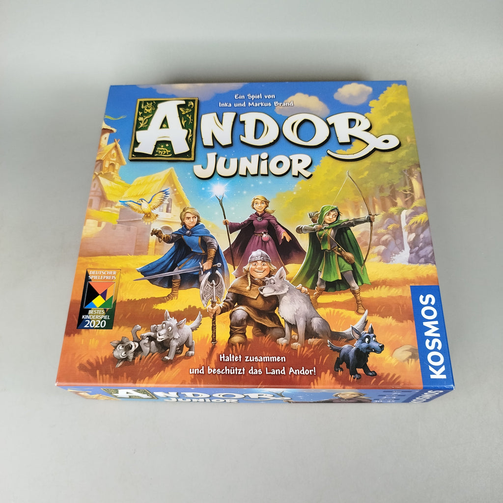 Hol dir das spannende Brettspiel Andor Junior von Kosmos und stürze dich in ein gemeinsames Abenteuer voller Fantasie und Mut. In diesem kooperativen Spiel für 2–4 Spieler schlüpfst du in die Rolle junger Helden, um das Königreich Andor zu beschützen. Das Spiel wurde 2020 mit dem Deutschen Spielepreis als Bestes Kinderspiel ausgezeichnet. Es enthält zahlreiche Figuren, Würfel und Plättchen für abwechslungsreichen Spielspaß. Das Spiel befindet sich in gutem gebrauchten Zustand, die Vollständigkeit konnte nicht überprüft werden. Hinweis: Nicht für Kinder unter 3 Jahren geeignet, da Kleinteile verschluckt werden können.