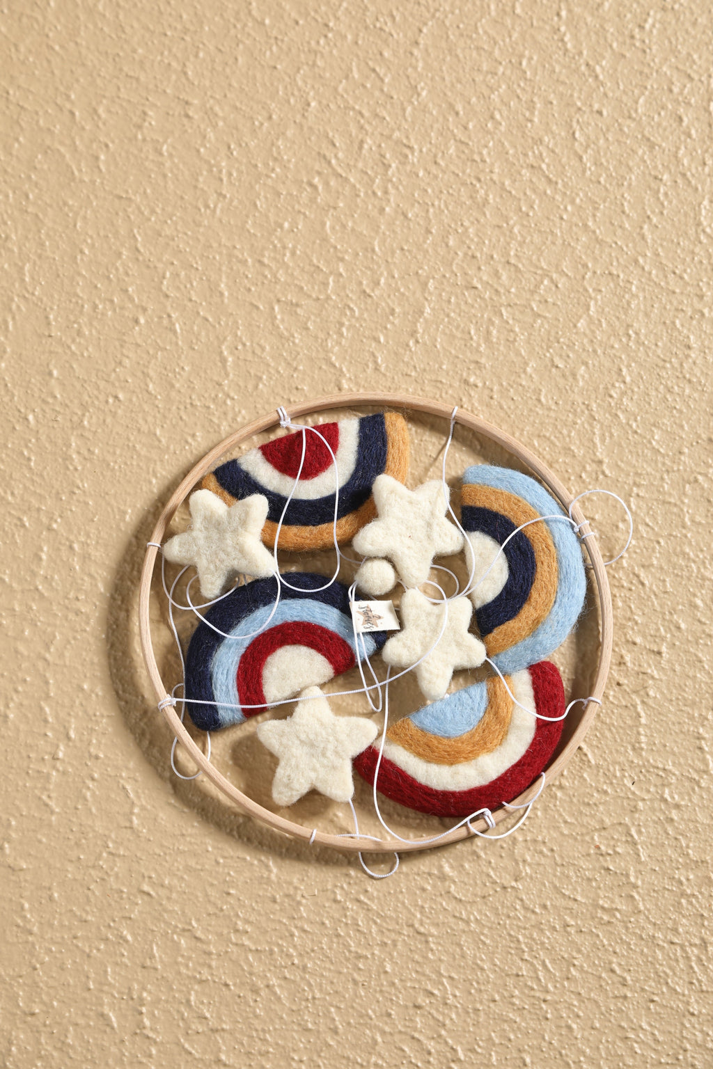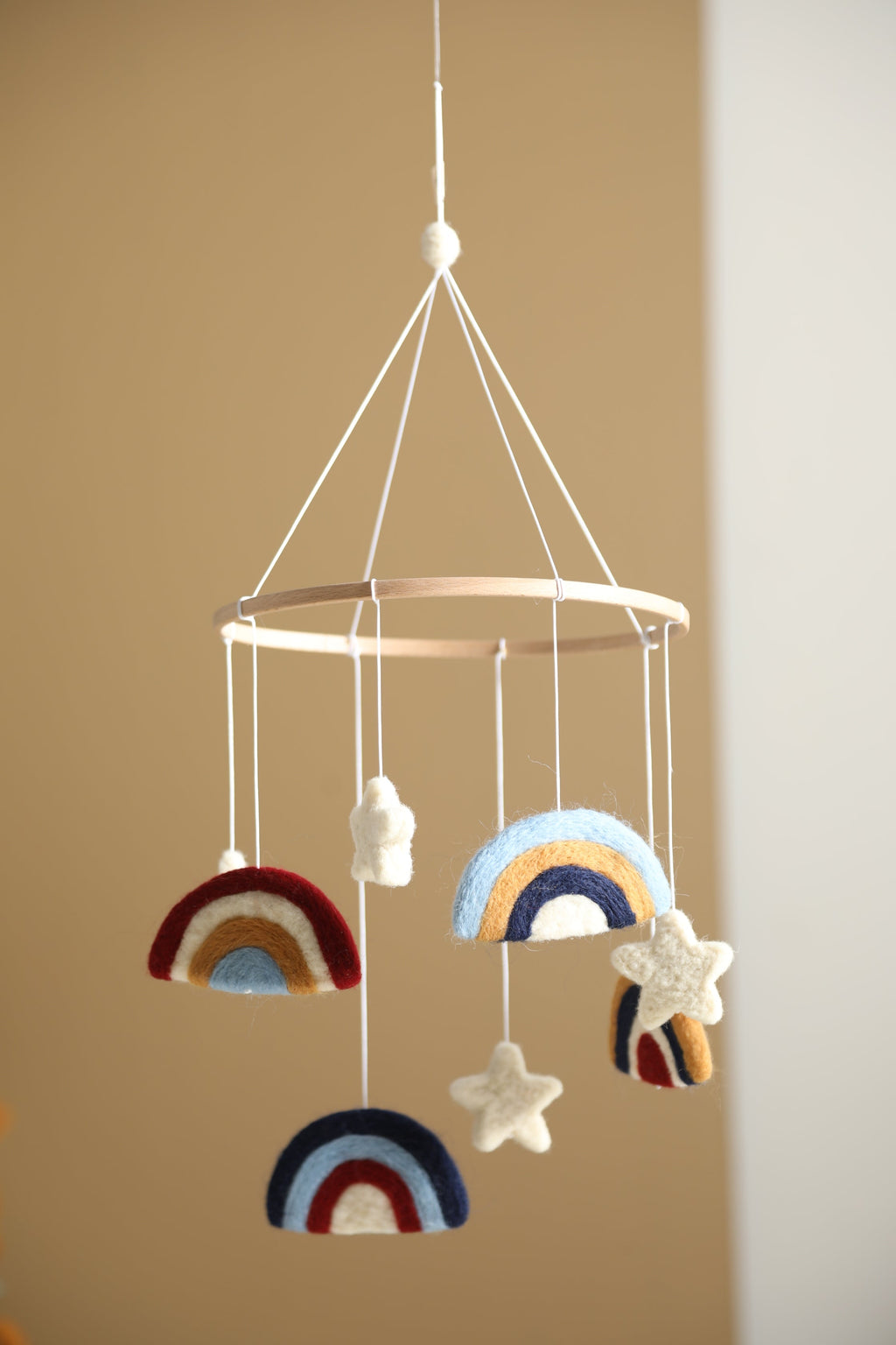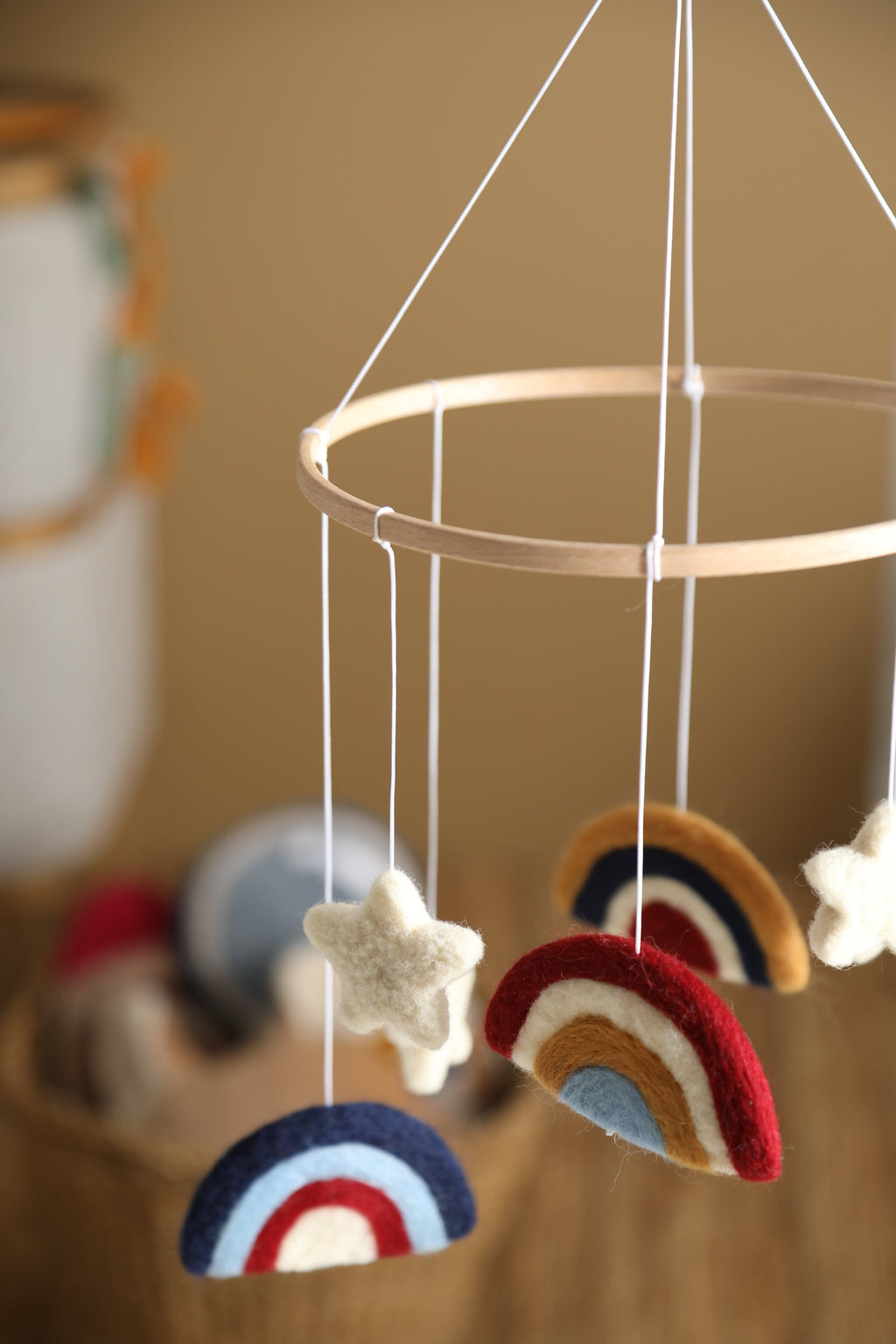 Mit sanft gefilzten Regenbögen und Sternen in warmen Naturtönen bewegt sich das Mobile leicht in der Luft und wirkt beruhigend auf das Baby.