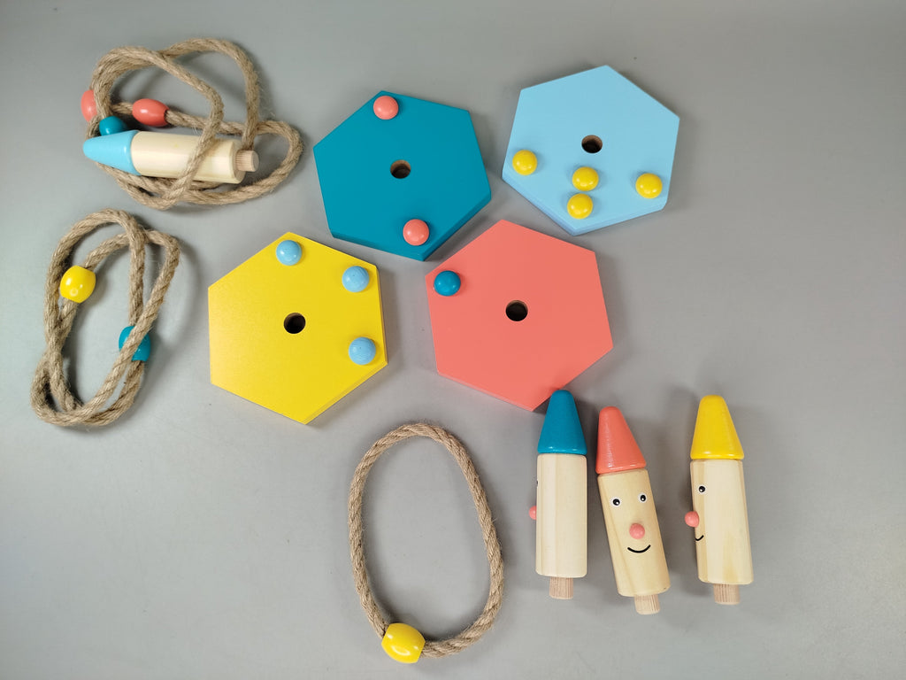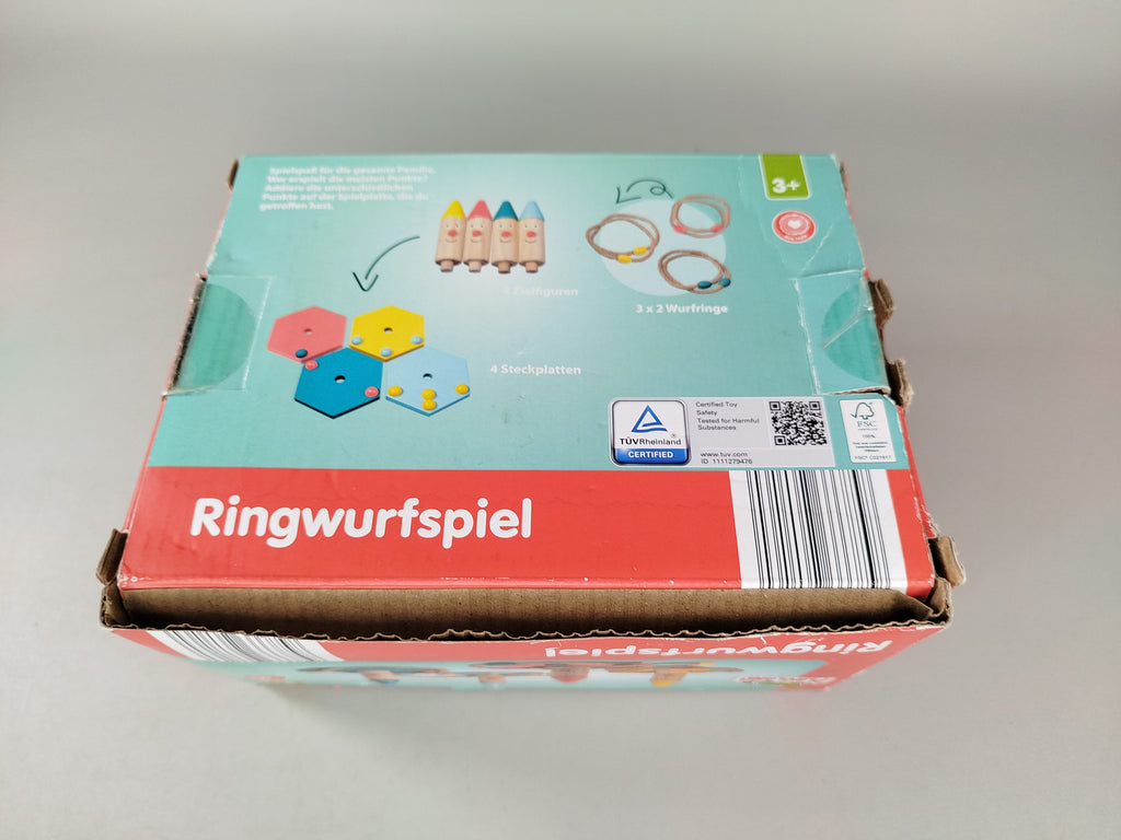 Hol dir das Ringwurfspiel von Playland und bring den Spaß direkt nach Hause! Enthalten sind 4 bunte Holzbasen, 4 süße Zielscheibenfiguren mit bemalten Hüten und 6 Seilringe mit passenden farbigen Perlen. Perfekt für Kinder ab 3 Jahren, um ihre Zielgenauigkeit zu testen und die Hand-Augen-Koordination zu verbessern. Gib diesem Spielzeug ein neues Zuhause und unterstütze die Wiederverwendung von Spielzeug!