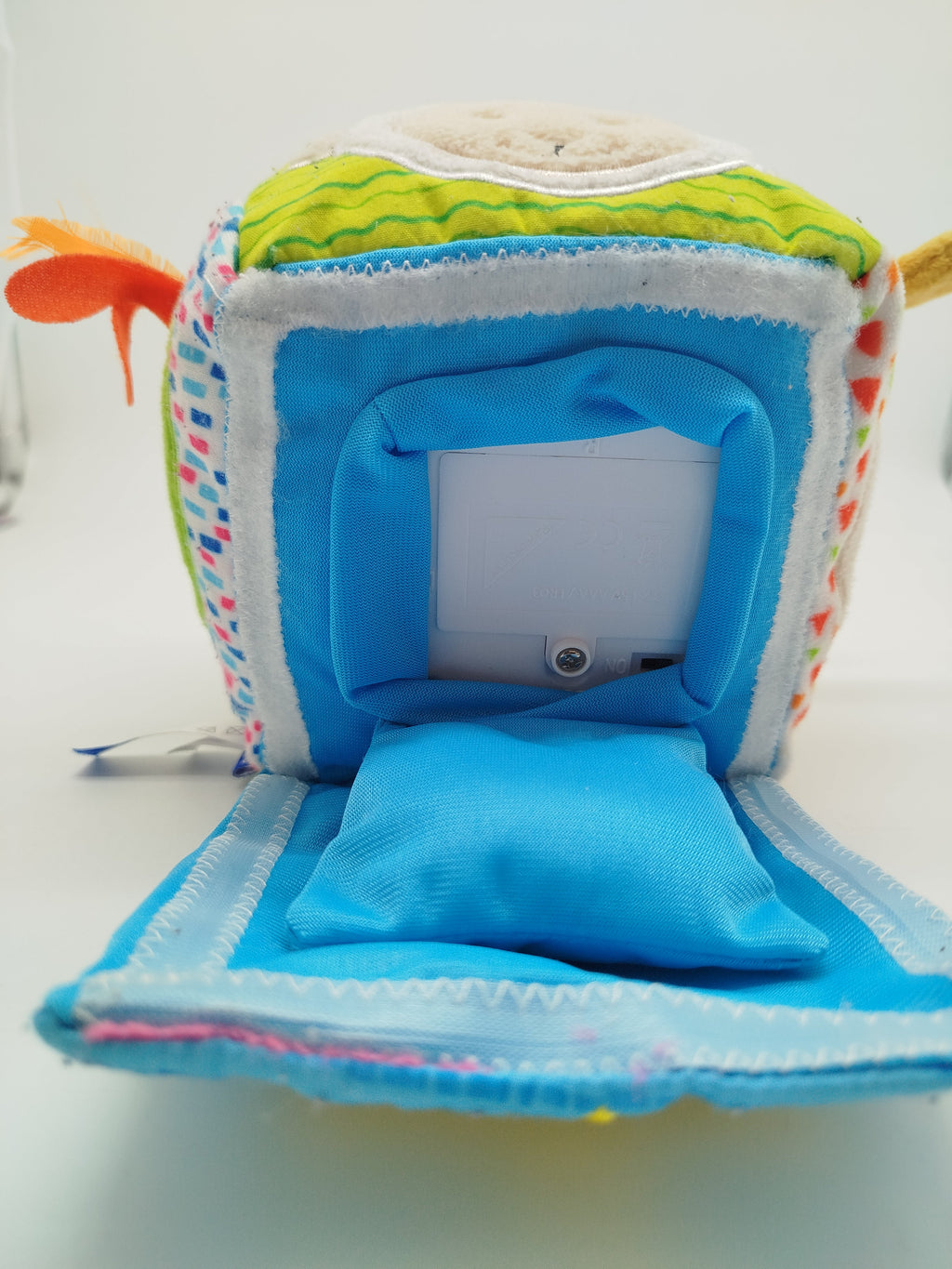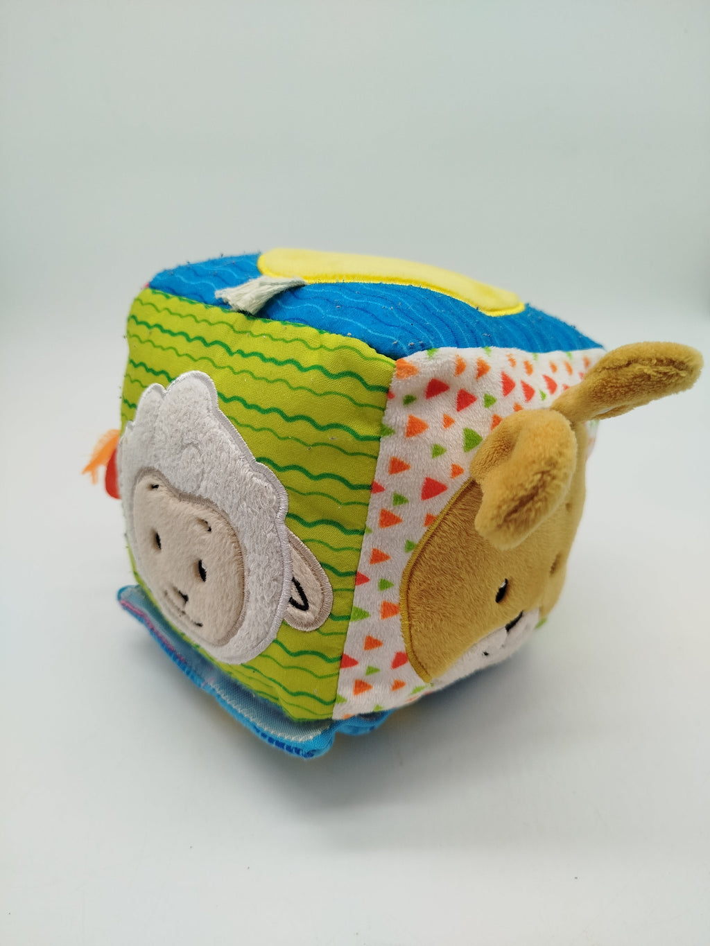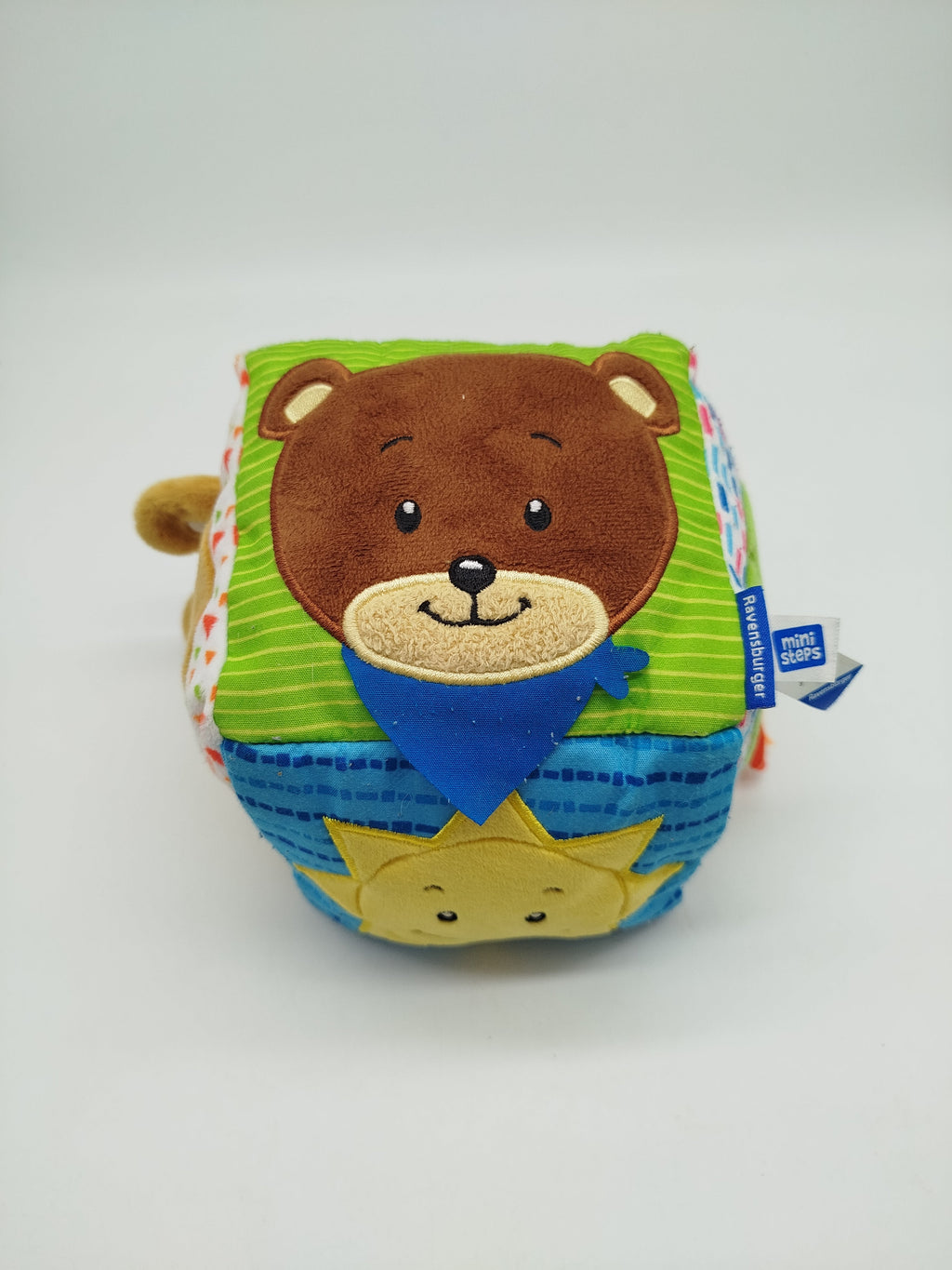 Jede Seite des bunten Stoff-Spielwürfels der Marke Ravensburger zeigt ein anderes Tiermotiv wie Bär, Lamm oder Hund sowie spielerische Elemente wie eine Sonne. Verschiedene Stoffstrukturen regen den Tastsinn an, während ein integriertes Soundmodul für akustische Abwechslung sorgt. Das Fach für 3 AA-Batterien ist mit Klett gesichert (Batterien nicht enthalten). Verpackung fehlt, dennoch befindet sich das Spielzeug in einem guten gebrauchten Zustand ohne erkennbare Mängel. Gib diesem Spielzeug ein neues Zuhause und unterstütze die Wiederverwendung von Spielwaren. Für Kinder unter 12 Monaten geeignet.
